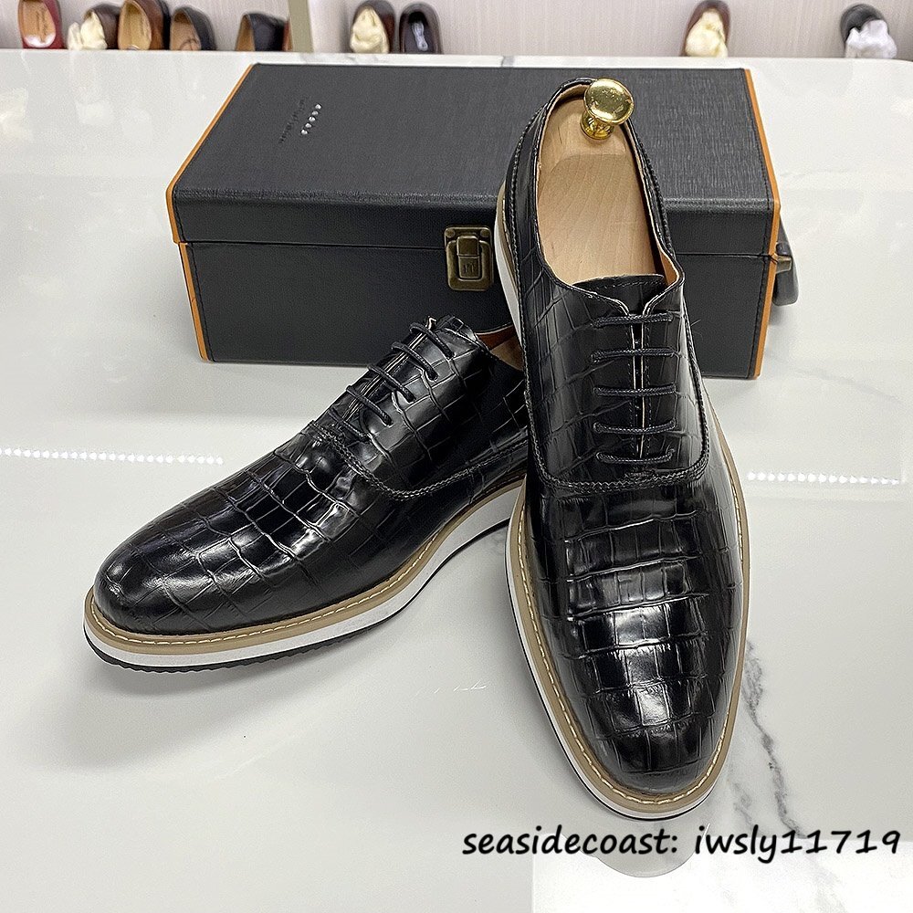 定価9万☆本革レザーシューズ メンズ スニーカー 鰐柄 職人手作り ビジネスシューズ 紳士靴 厚底 革靴 牛革 通勤 超軽量 ブラック 24.5cm