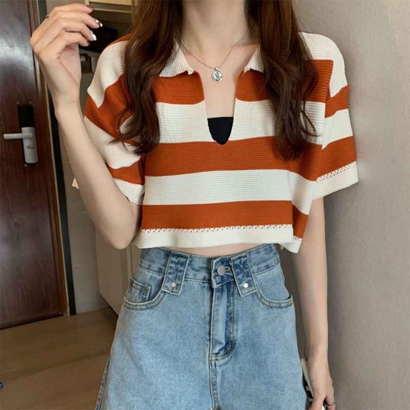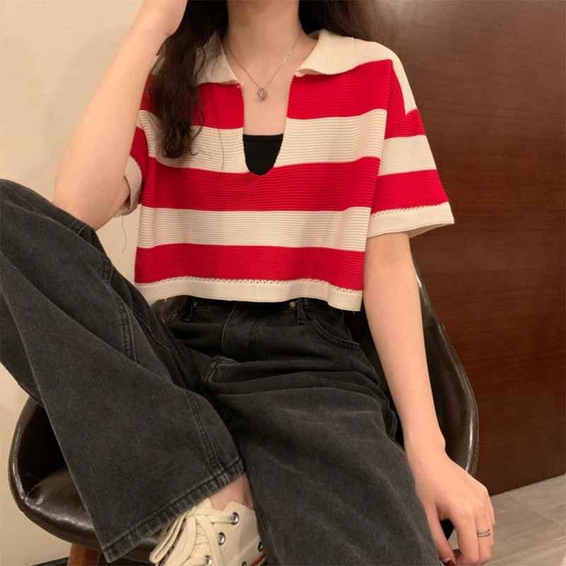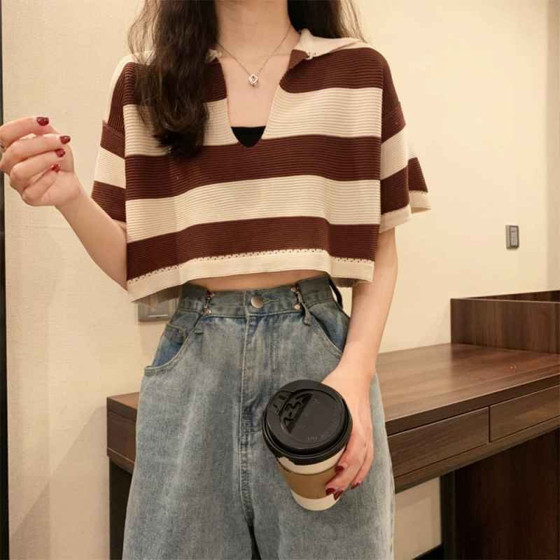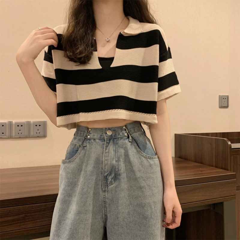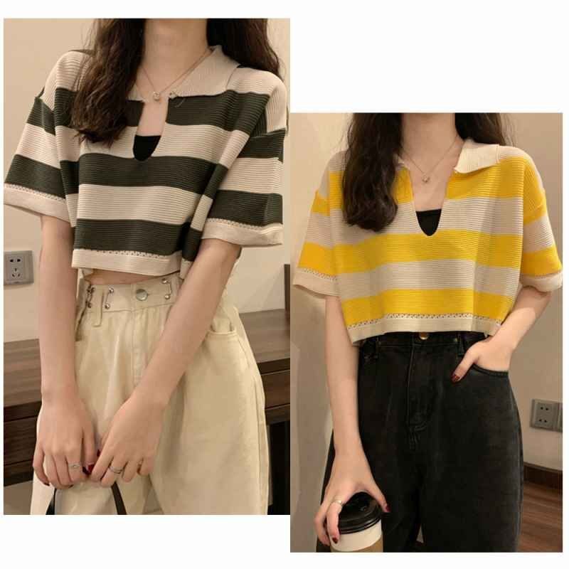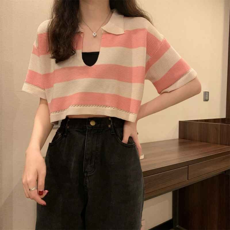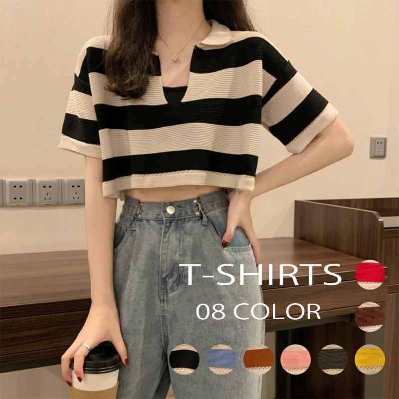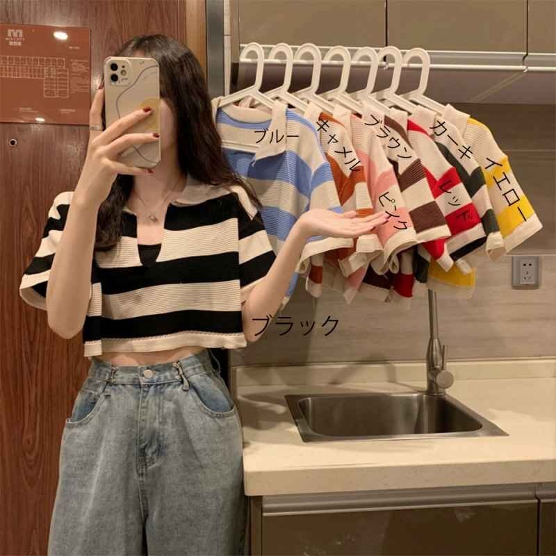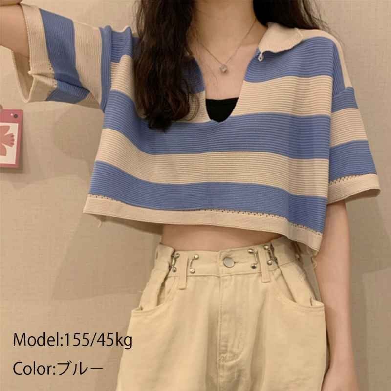 ボーダー柄ショット丈サマーニットトップス