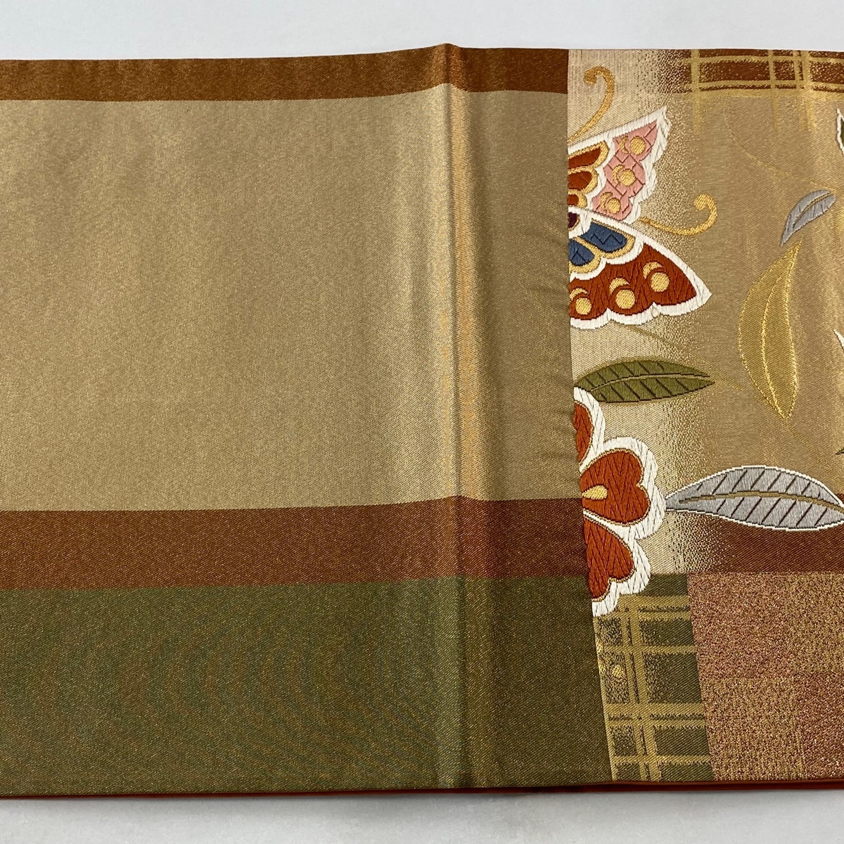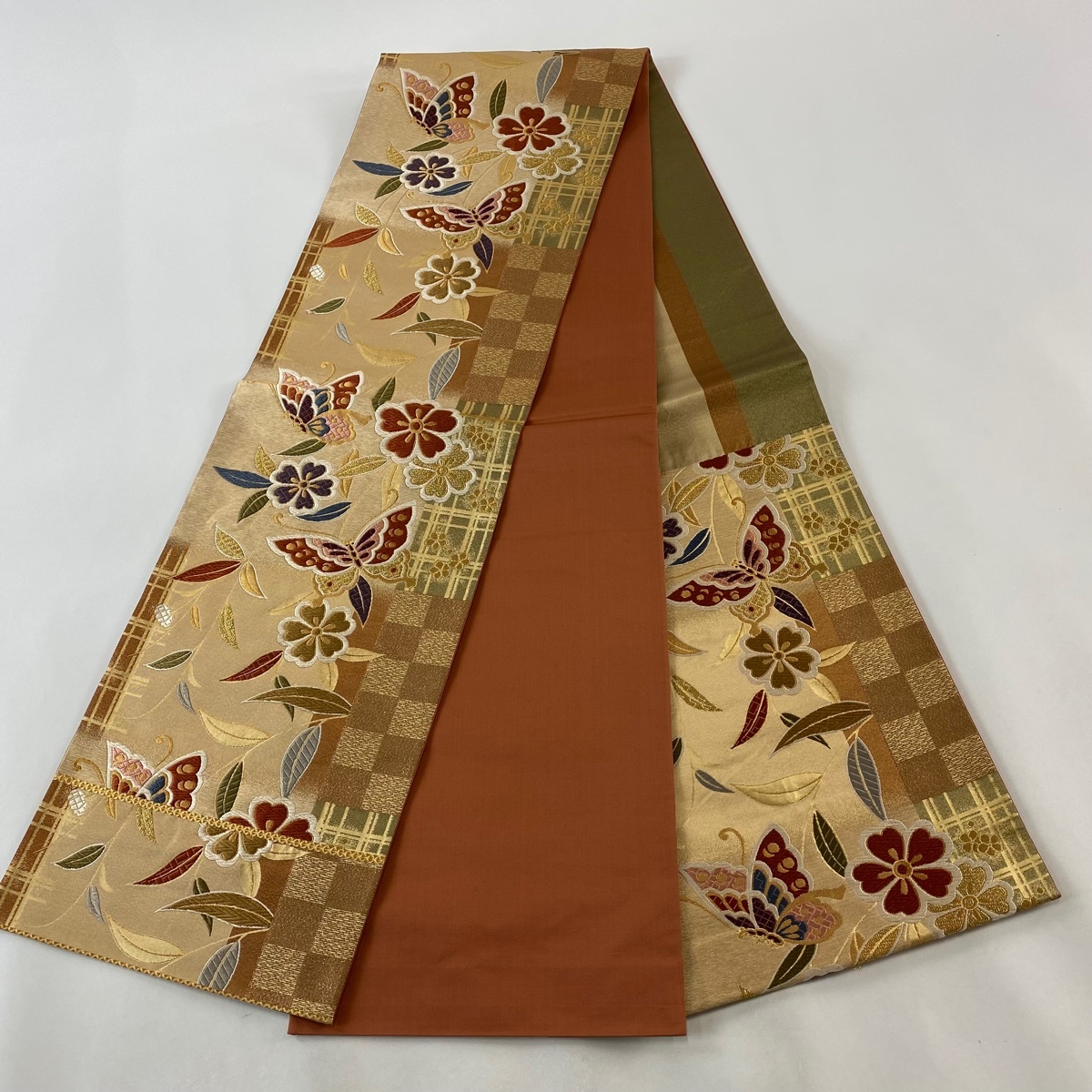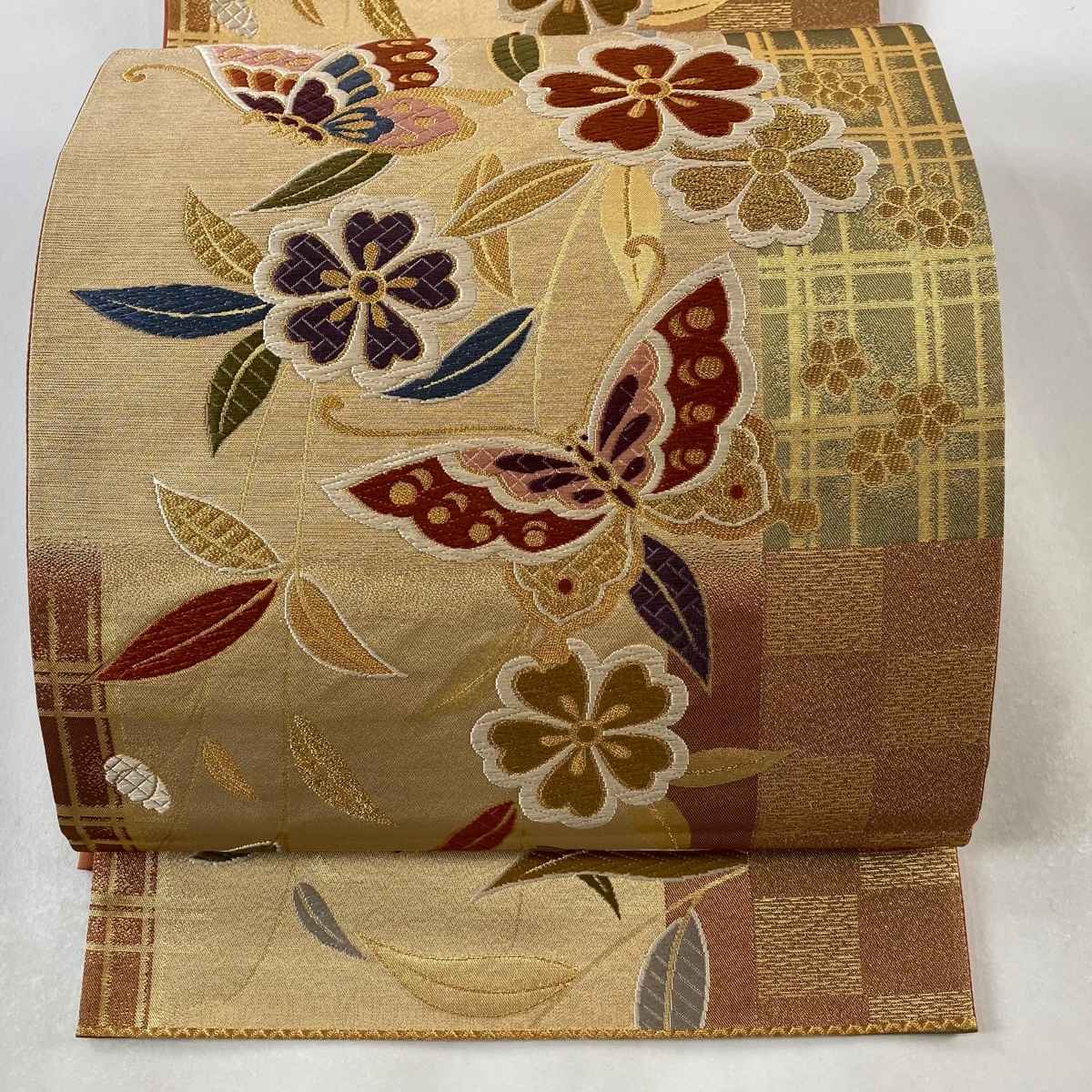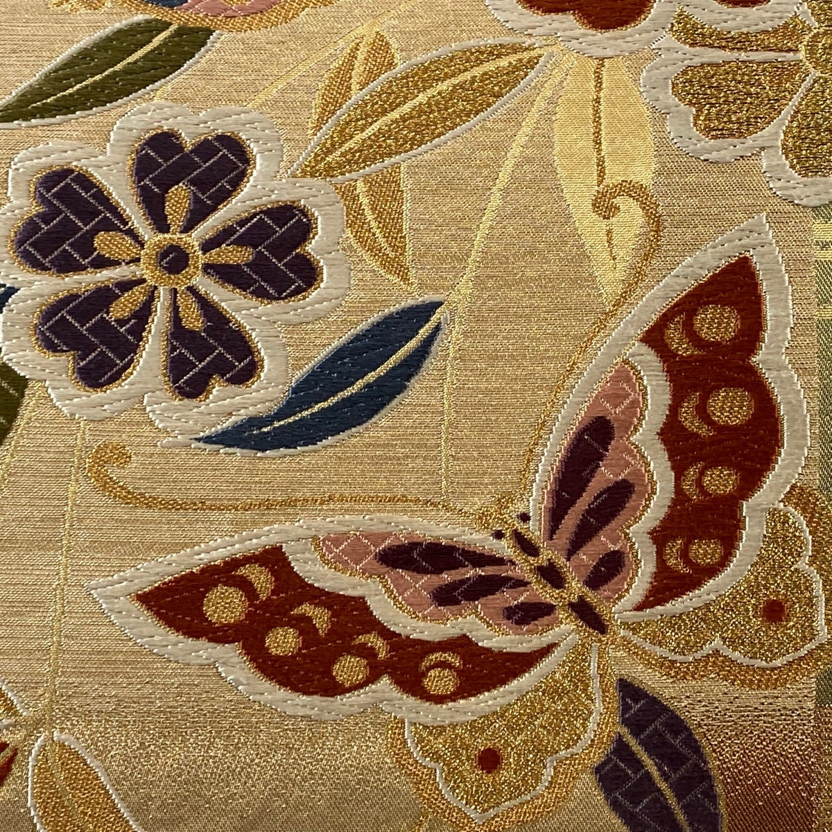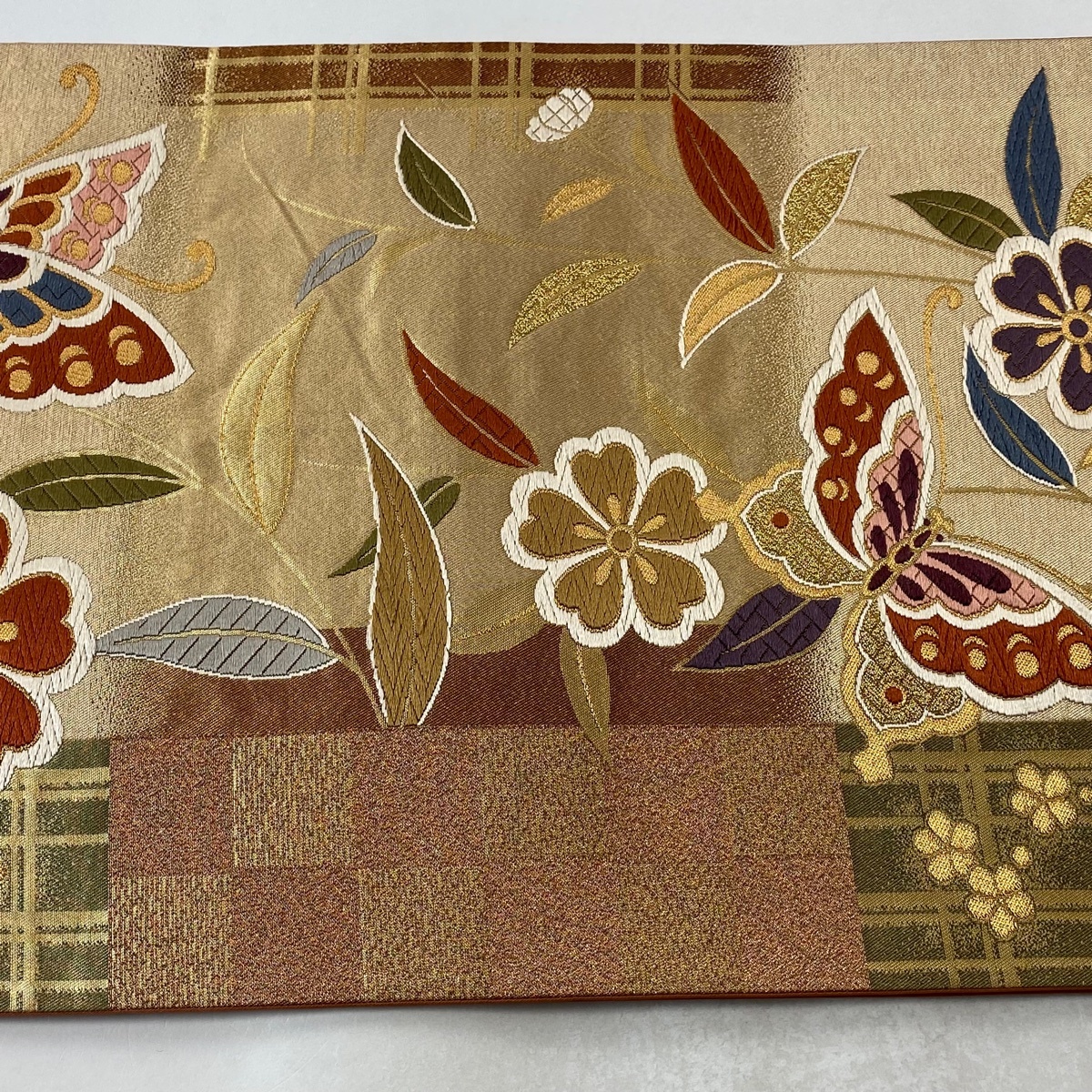 | 袋帯 美品 秀品 関西仕立て 蝶 桜 唐織 箔 金色 六通 正絹 【中古】 |