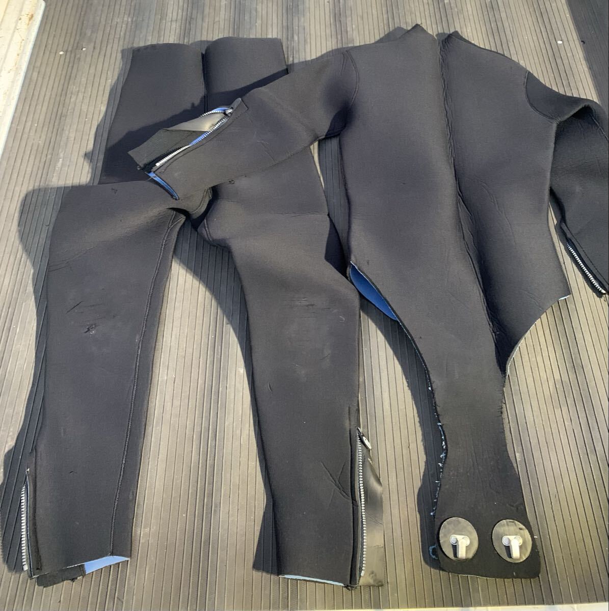 ※ウエットスーツにサイズ等の記載がない為サイズは不明になります。また、スーツ、フェイスマスクにMNと言う字が書かれております。また、中古品である為、商品の黄ばみや汚れなどがあります。