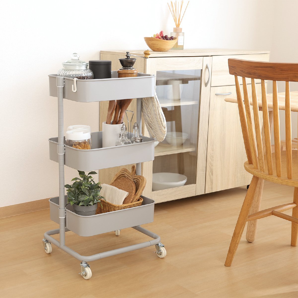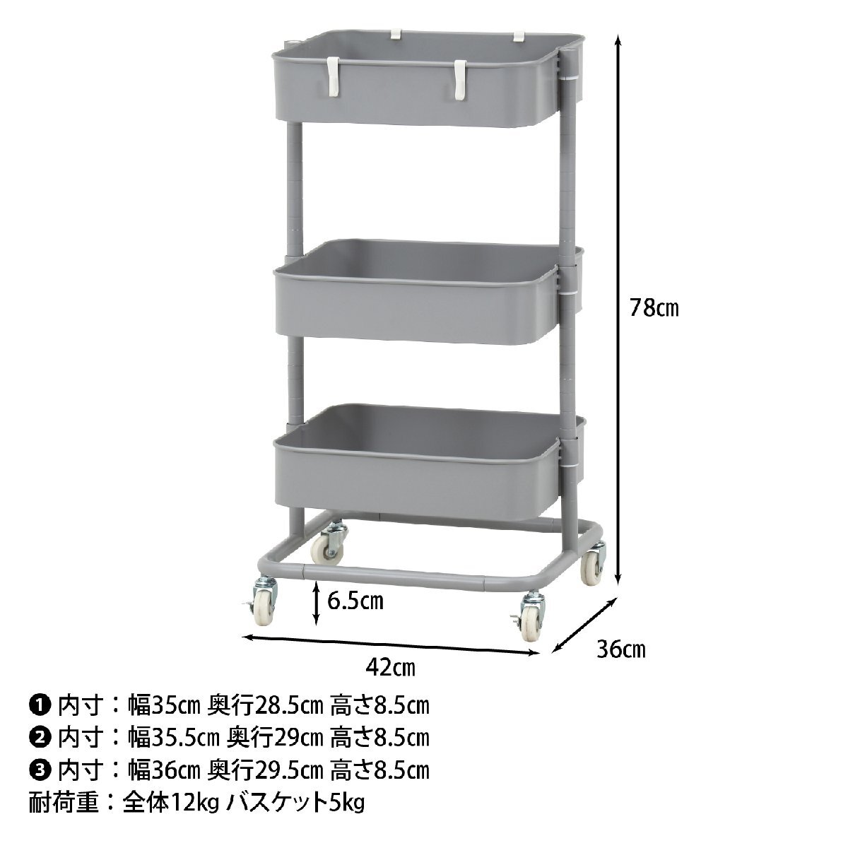 | 備 考 | ■ネジいらずでクイックに組み立て可能です。 ■バスケットの高さを調整できるトローリーワゴンです。 ■おしゃれなインテリアワゴンです。 |