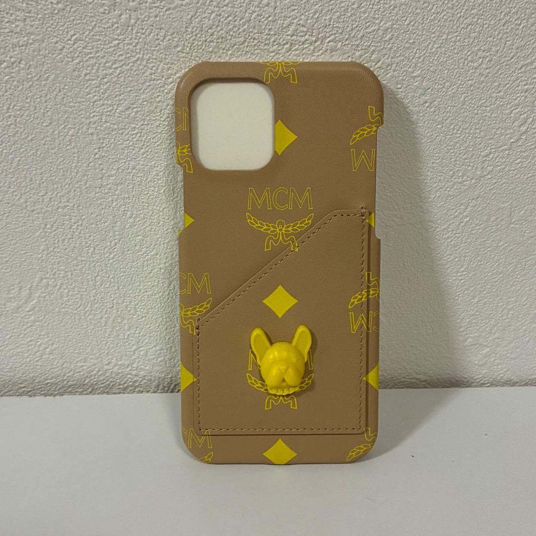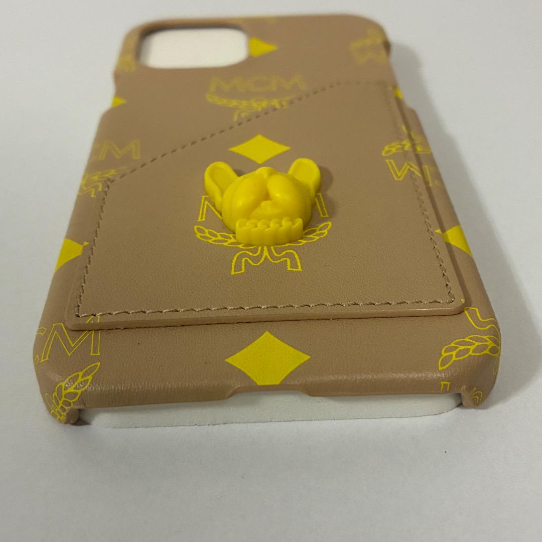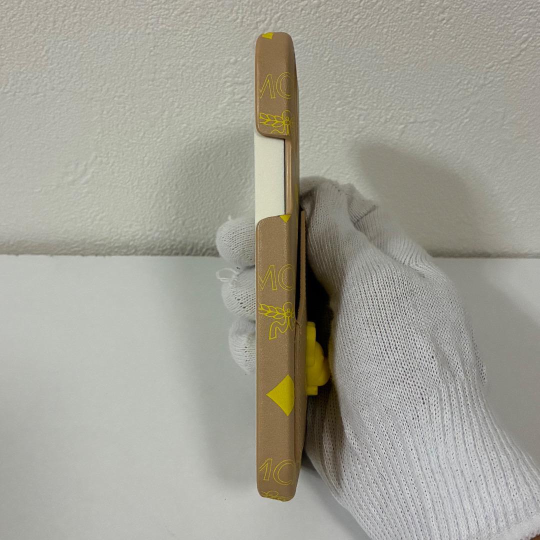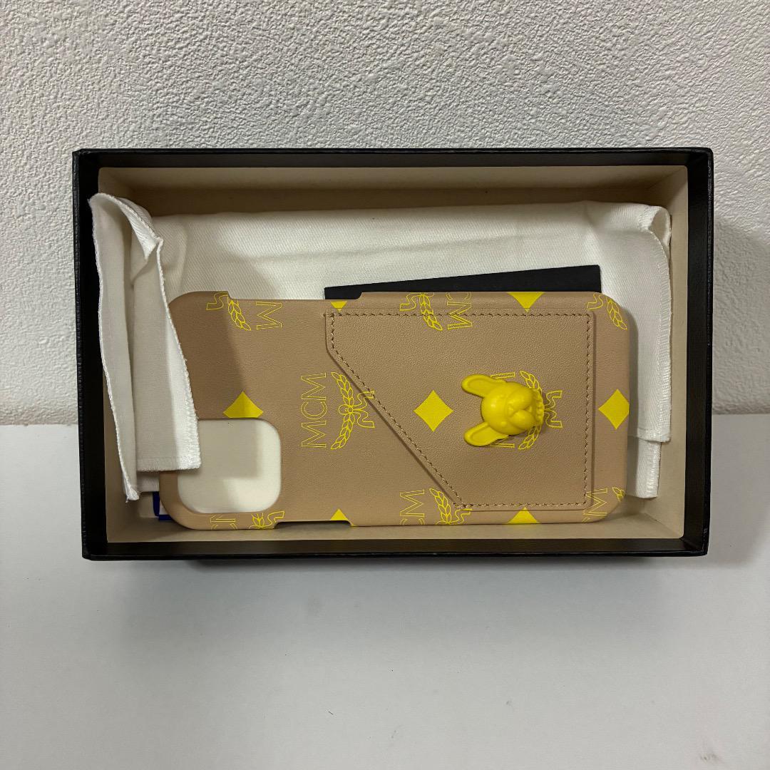 MCMのベージュiPhoneケース、イエローモチーフ付き、付属品完備。