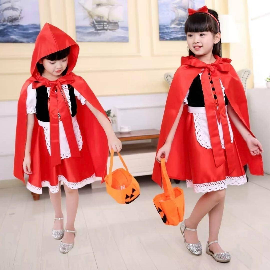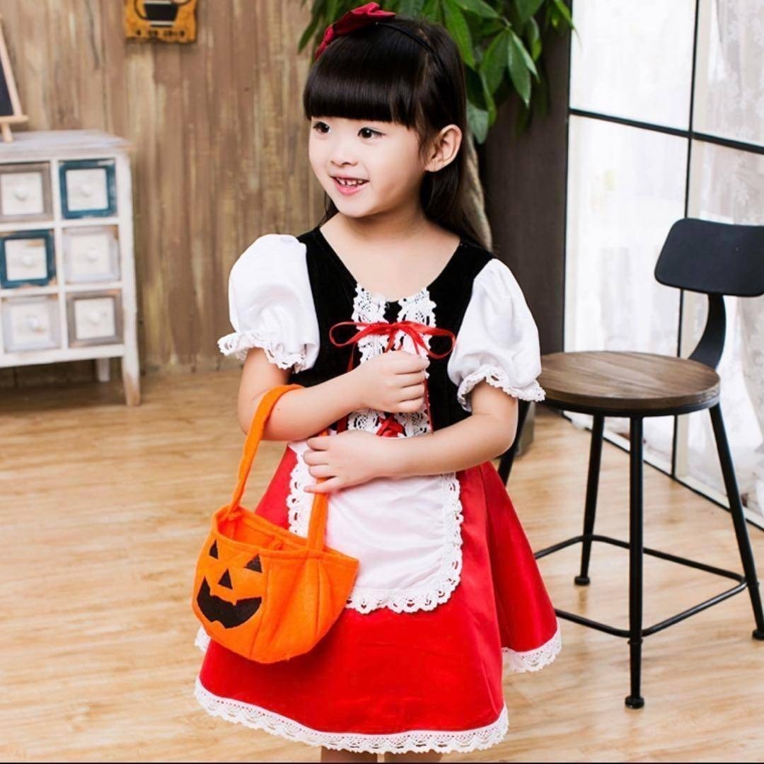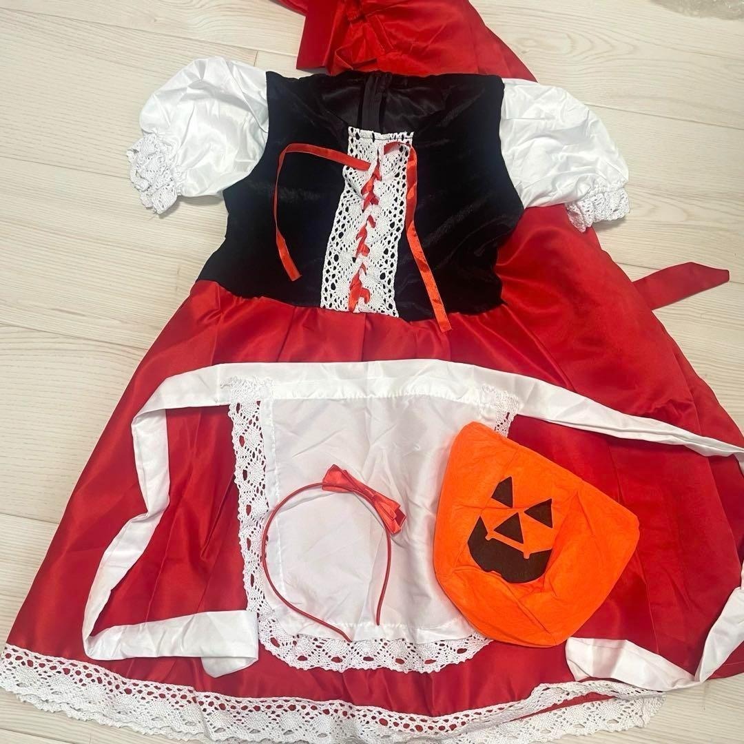 半袖ワンピースに白いレースのエプロン、フード付きの赤ずきんマント、赤いリボンのカチューシャ、そして可愛らしいカボチャバッグが揃った5点セットとなっています。