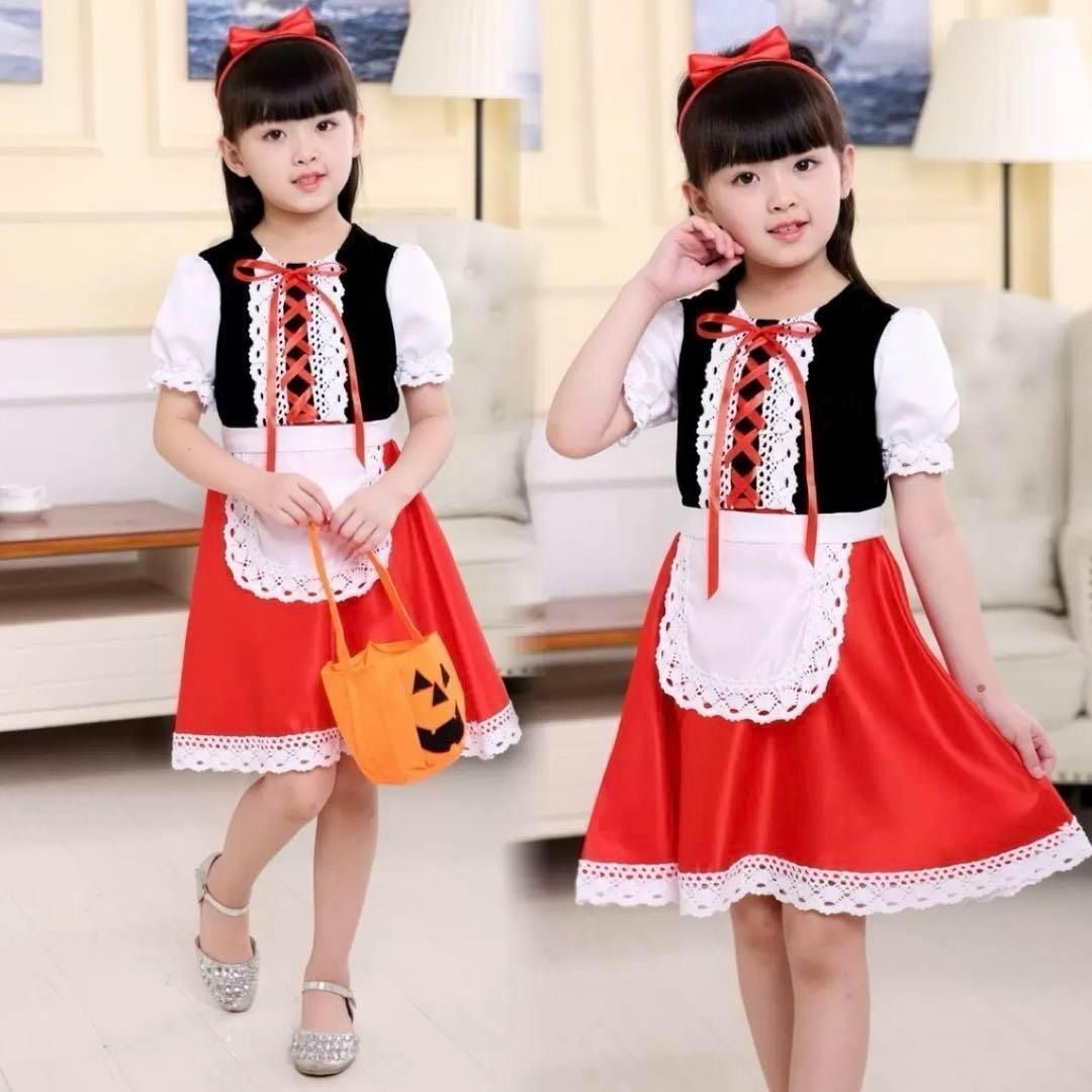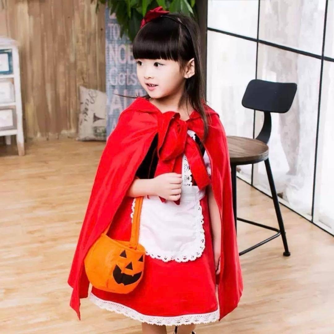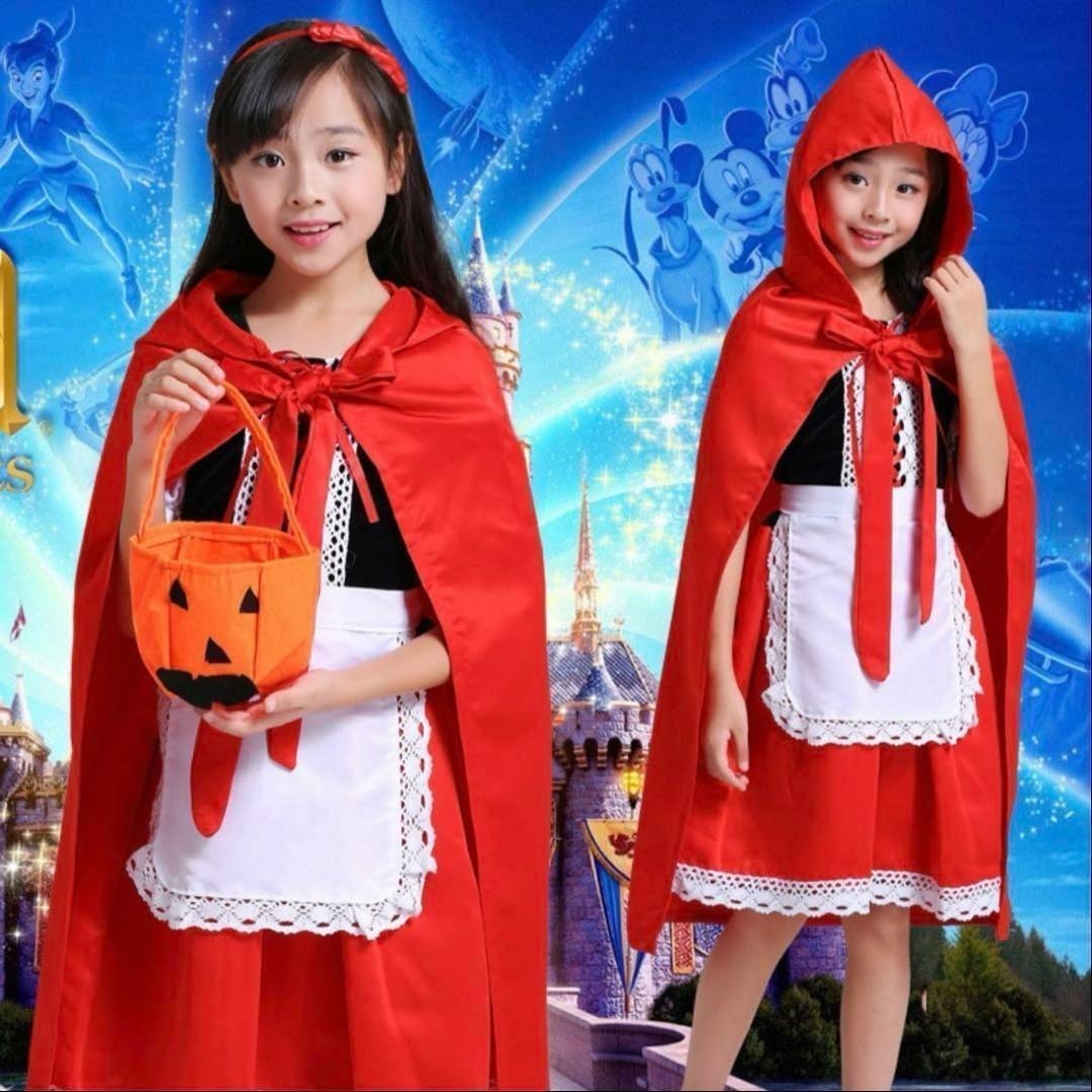 半袖ワンピースに白いレースのエプロン、フード付きの赤ずきんマント、赤いリボンのカチューシャ、そして可愛らしいカボチャバッグが揃った5点セットとなっています。