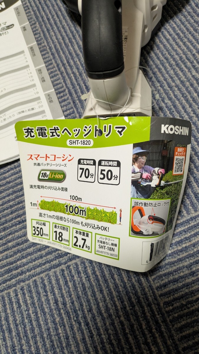 工進 スマートコーシン 18V 充電式ヘッジトリマ SHT-1820 バッテリー・充電器付き