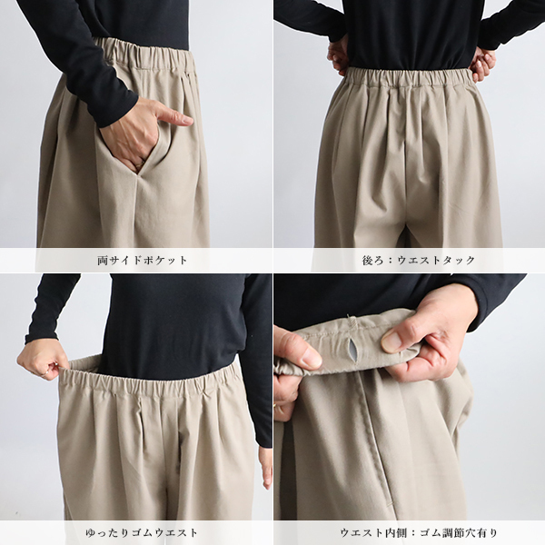 ・穿きやすいウエスト総ゴム入り&自分で調節できるウエストゴム穴付き。