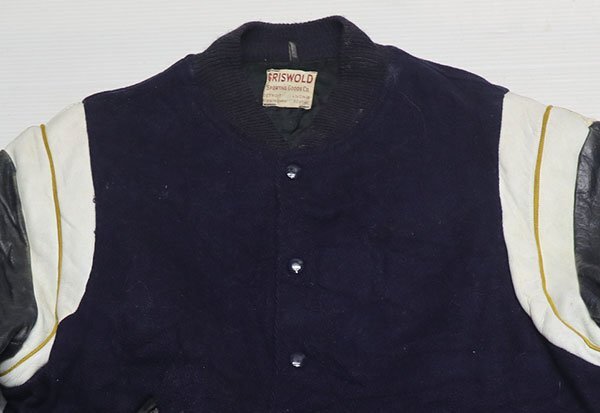 アメリカ買い付けの70年代頃のアメリカ製(表記はございませんが)の袖&襟&ポケット縁がレザーのアワードジャケットの濃紺系xクリーム系です。