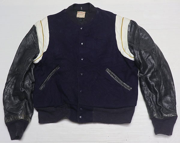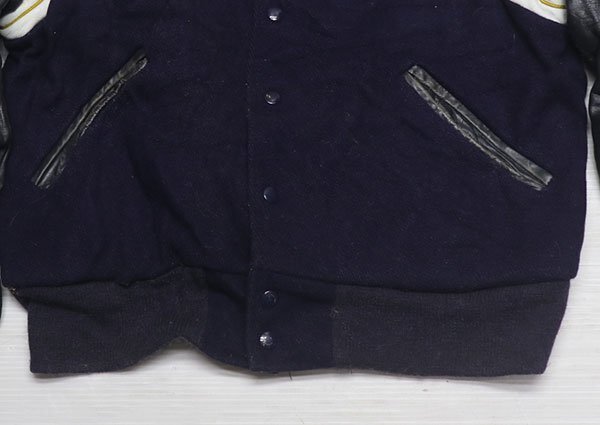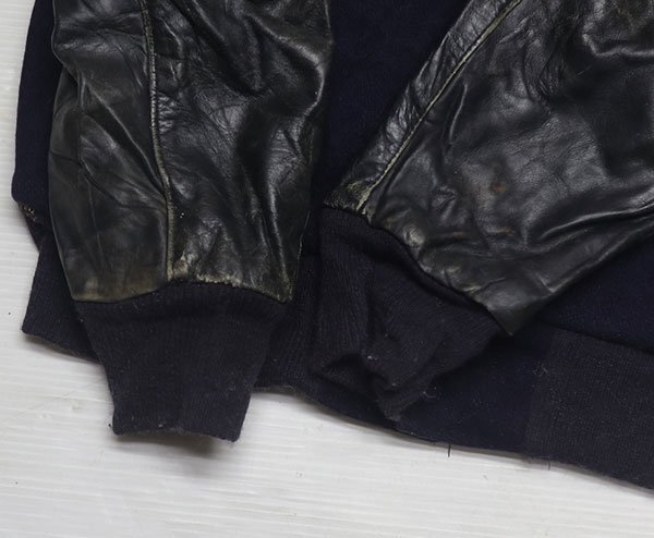 WJ39袖革スタジャンunknownアメリカ製アワージャケットLビッグサイズ70'Sビンテージ/チェーンステッチ文字ウールジャケット濃紺系オールド
