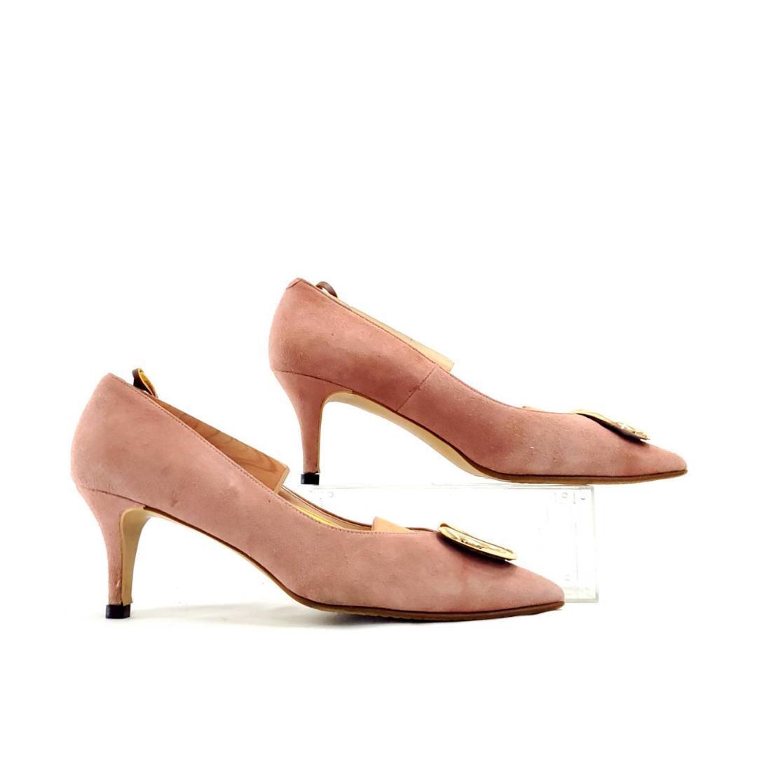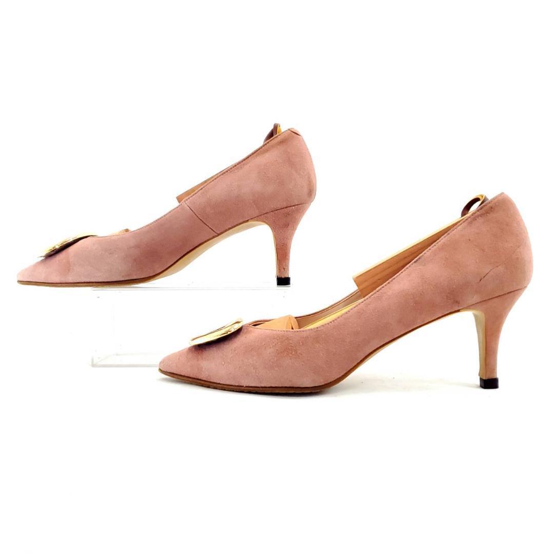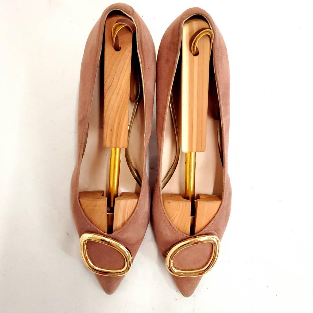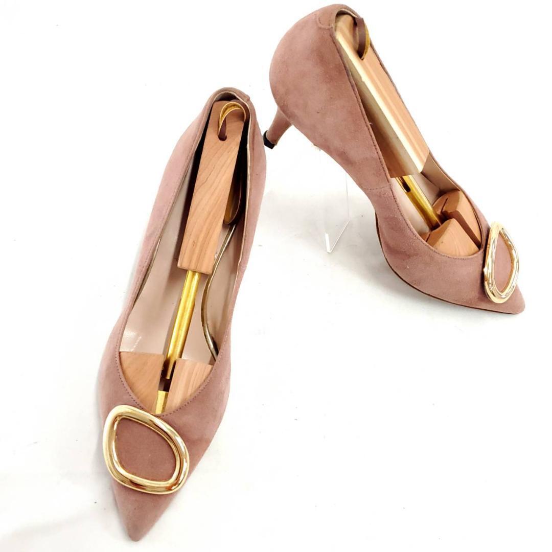落ち着いたくすみピンクのスエード素材に、ゴールドのオーバルバックルがアクセントになった、上品で華やかな一足。