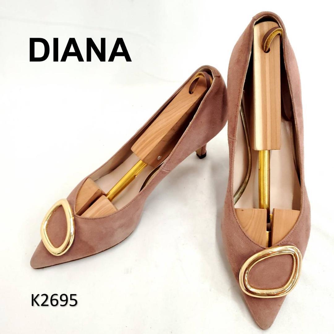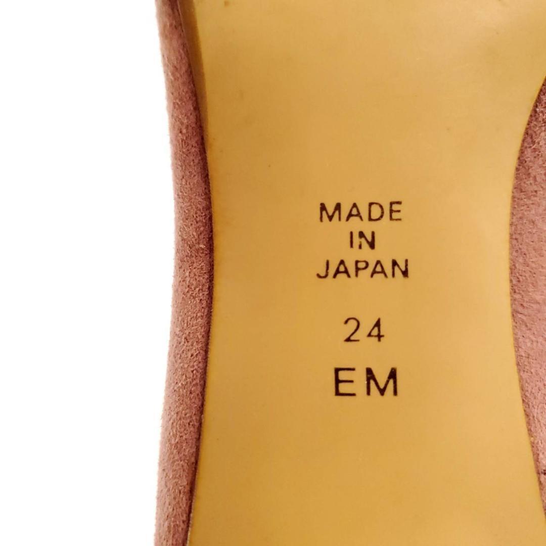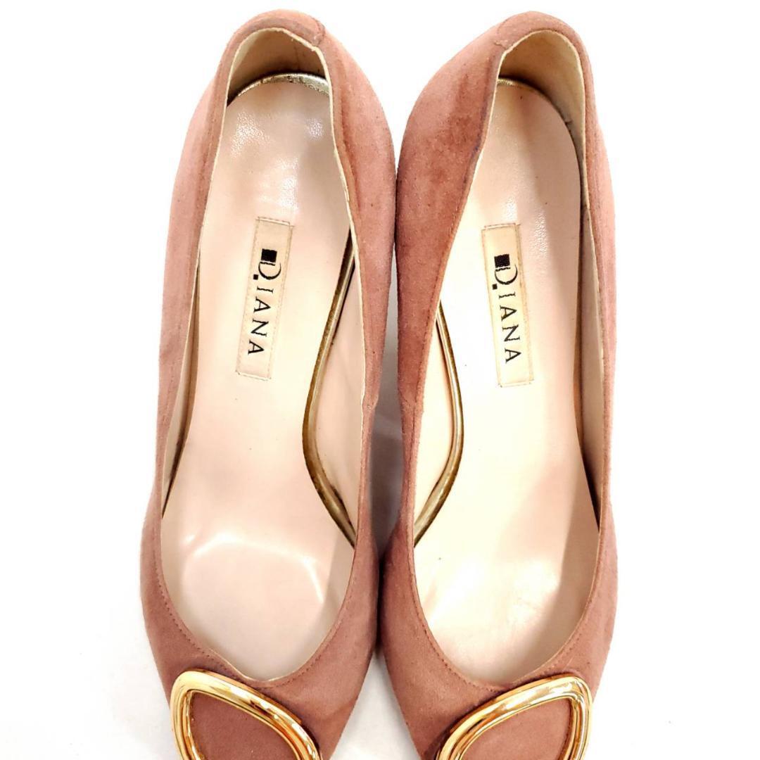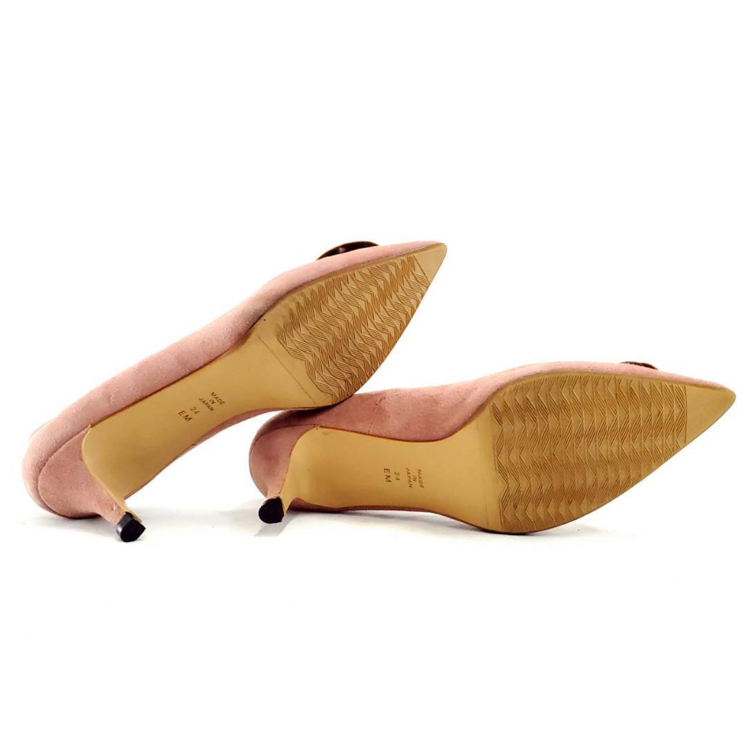 落ち着いたくすみピンクのスエード素材に、ゴールドのオーバルバックルがアクセントになった、上品で華やかな一足。