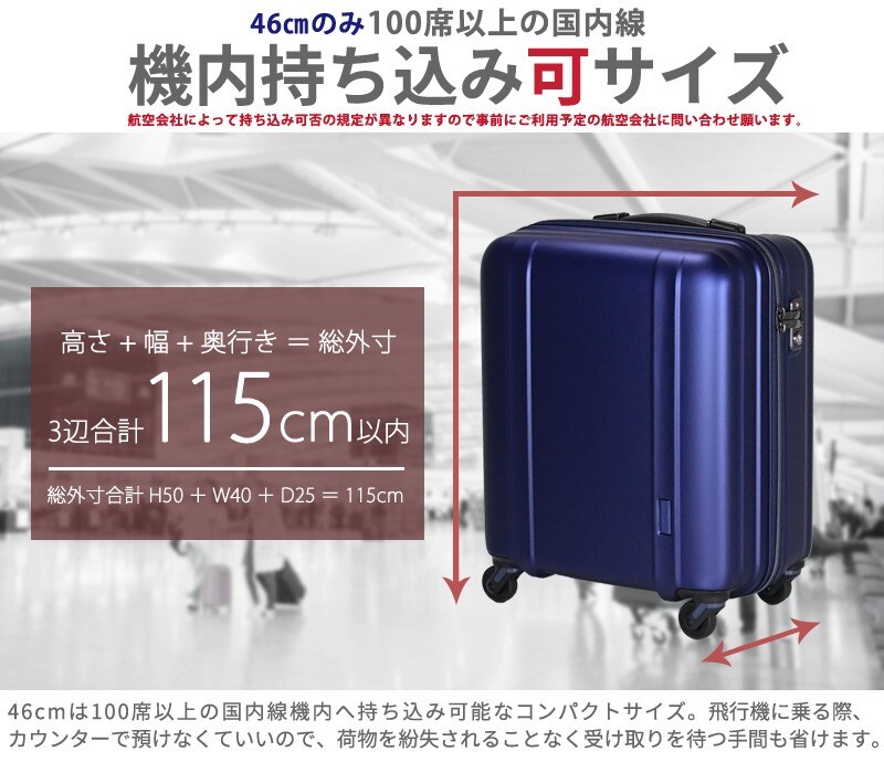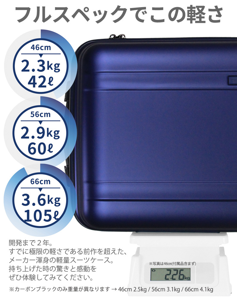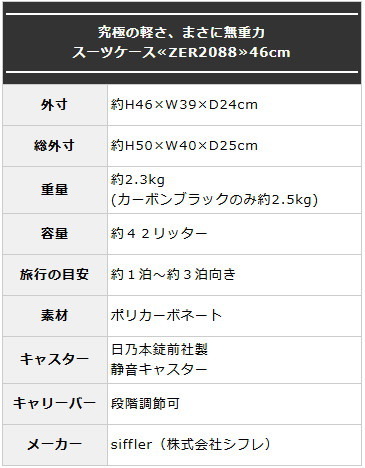 進化を遂げた軽量ボディ 心も足取りも軽くするスーツケース≪ZEROGRA2/ゼログラツー≫ 驚きの軽さと快適性をぜひ体感して下さい。 ![]() ![]() ![]() ![]() ~超軽量 スーツケース ZEROGRA~ *カラー:マットネイビー *サイズ:約H46(50)×W39(40)×D24(25)cm ( )はキャスター・取っ手込み総外寸 *重量: 約2.3Kg *容量: 約42L(約1-3泊向き) *素材: ポリカーボネート *キャスター:静音キャスター(日乃本錠前社製) *通常価格:24,200円(税込) *メーカー:siffler(株式会社シフレ) *状態:未使用 アウトレット 美品