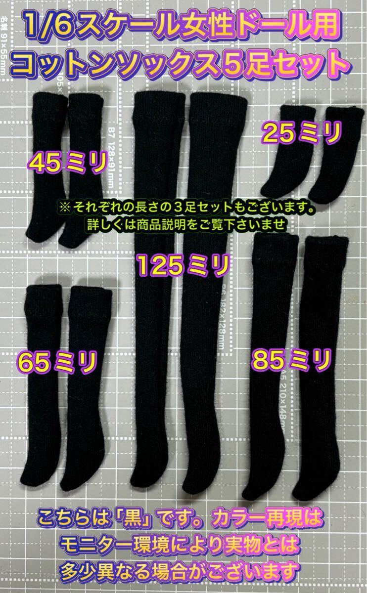 リカちゃん、ジェニー、ネオブライス、アイシードール 、オビツ27女性ボディ、ハッシュタグボディなどが着用出来る、ごくシンプルな綿のソックス長さ違い、平置きで約125ミリ、85ミリ、65ミリ、45ミリ、25ミリの5足セットです。