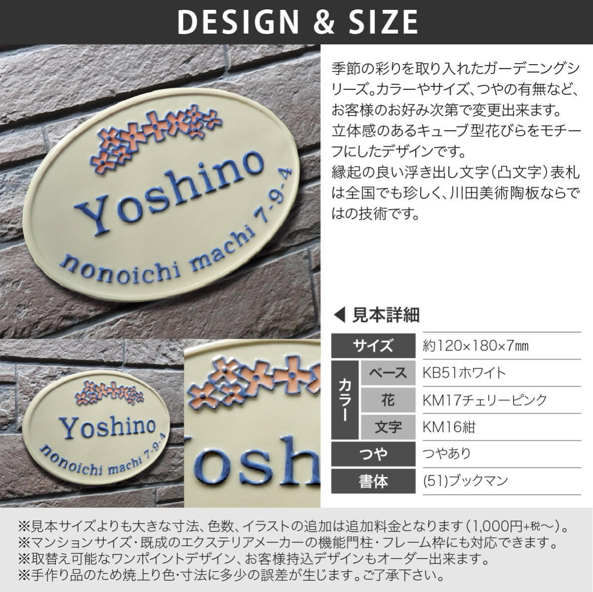 | 商品詳細 | 季節の彩りを取り入れたガーデニングシリーズ。カラーやサイズ、つやの有無など、お客様のお好み次第で変更出来ます。立体感のあるキューブ型花びらをモチーフにしたデザインです。縁起の良い浮き出し文字(凸文字)表札は全国でも珍しく、川田美術陶板ならではの技術です。 |