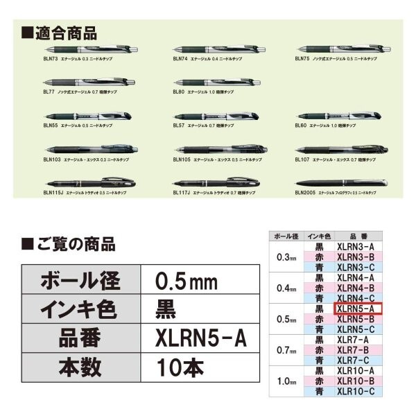 【材質】軸=PP ペン先=ステンレス【ボール径】0.5mm(極細)【インキ色】黒【適合商品】エナージェル(キャップ式)/ エナージェル / エナージェル エックス / エナージェルトラディオ / エナージェルフィログラフィ / エナージェルエス