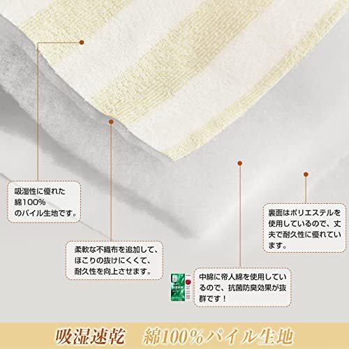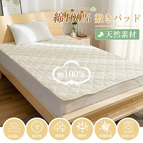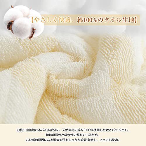 商品説明 | 【表地綿100%! シーツ不要も可】表側パイル部分:綿100% 表側グランド部分:ポリエステル100% 中綿:ポリエステル100%(抗菌防臭・「TEIJIN」の中綿使用)。肌触りが最高の上に、寝返りをしても、隅々まで柔らか触感を楽しめる使用感に意外とファンが多いです。毛玉やほつれができない、静電気も少ないため、ベッドカバーをかけず、そのまま寝ていただいても肌触りの心地よさを実感していただけます。 【抗菌防臭・「TEIJIN」の中綿】中わたにテイジンの機能繊維「マイティトップII ECO」を使用する。側生地にはダニを通しにくい加工を施しているので敏感なアレルギー体質の方や小さなお子様にも安心。SEK認証された優れた抗菌防臭効果で、湿気や寝汗などによる菌の増殖を抑えてそれによって引き起こされる嫌なニオイの発生も防ぎます。 【天然素材・優れた吸水速乾性】表面は優しい肌触りのタオル生地なので、吸水性が高く水分を放出してくれる働きがあります。汗をかいても爽やかで、さらっと快適に過ごすことができます。ふっくらお肌にやさしい、パイル生地の汗取りパッドです。春・夏・秋を通してお使いいただけます。 【オールシーズンで使える】:耐久性も高い綿100%表生地の敷きパッドは、汗の季節も冷える季節もオールシーズン活躍してくれる敷きパッドです。速乾性がよくて、吸汗通気、お手入れ簡単です。お客様を満足させるように努めていきますので、敷きパッドは不具合がある場合、商品自体の問題がある場合(初期不良など)は、弊社にご連絡いただければ迅速に対応いたします。 【丸洗いok・強化ゴムバンド付】毎日使う寝具だから、やっぱり汚れは避けられません。ご自宅で気軽に洗濯できます。敷パッドの裏面にすべり止め加工がされ、四隅にもゴムバンドが付いていて、マットレスや布団にしっかり固定、寝返りしてもずれにくいです。取り付けやすいので、交換するときもラクラク。