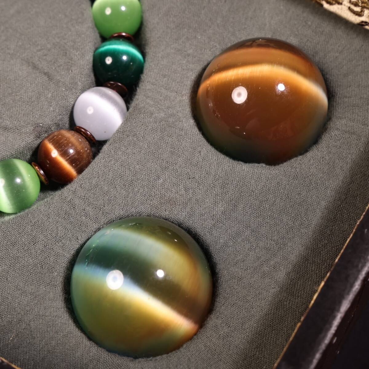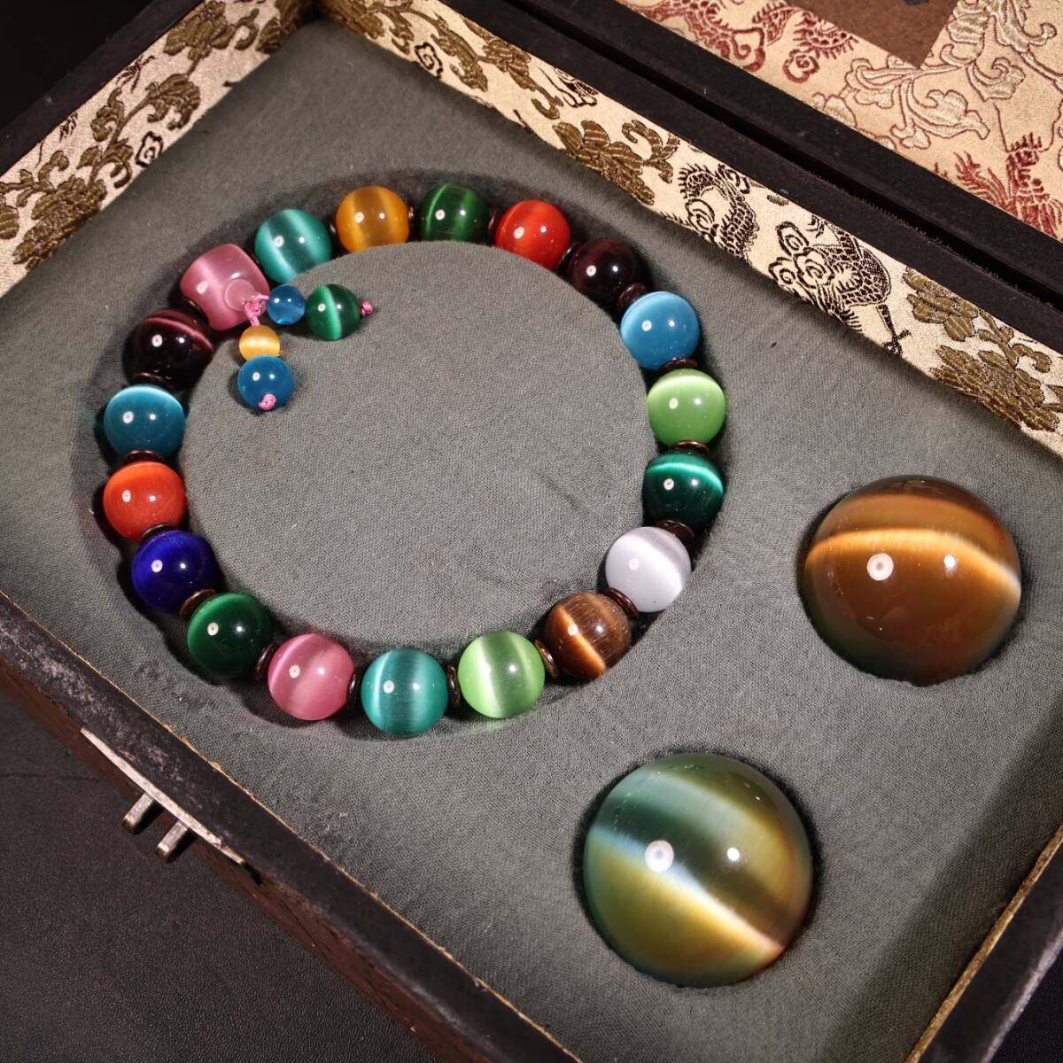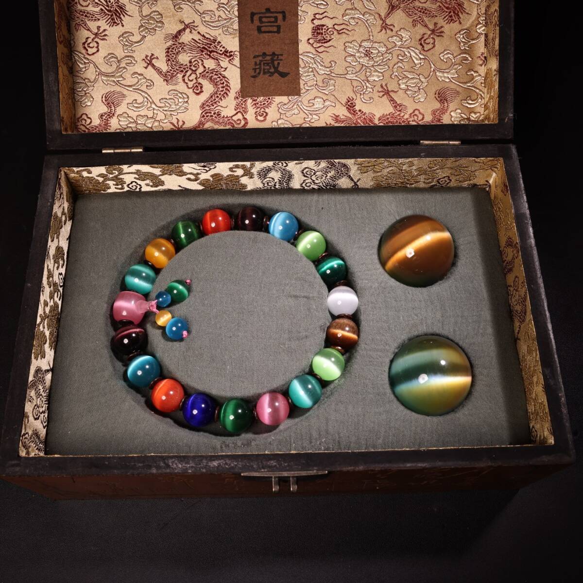 清時代 宮廷御供 古猫目石彫 多宝 七彩 猫目石 十八子手持 手球 把件 箱付 古擺件 時代物 古董品 骨董 收集 旧蔵出 唐物 中国古玩 古美術品