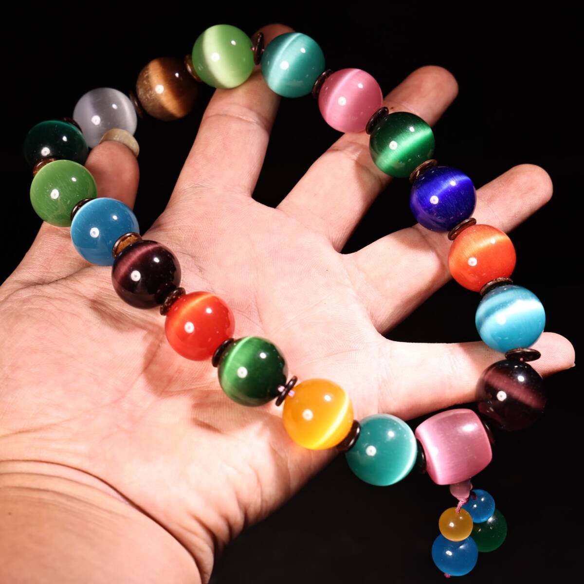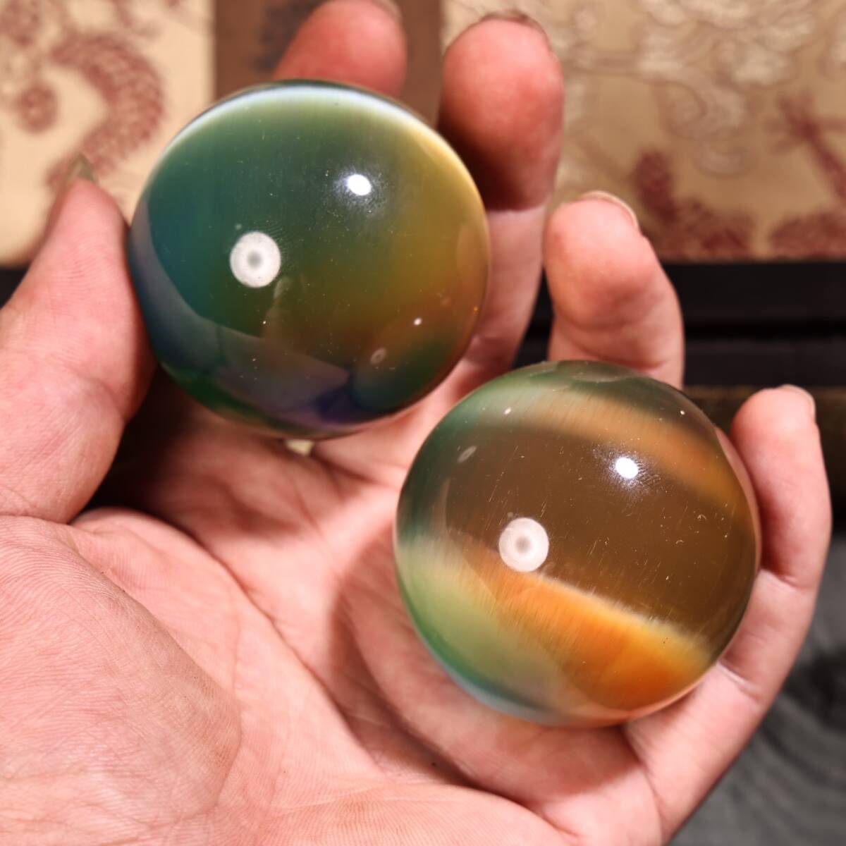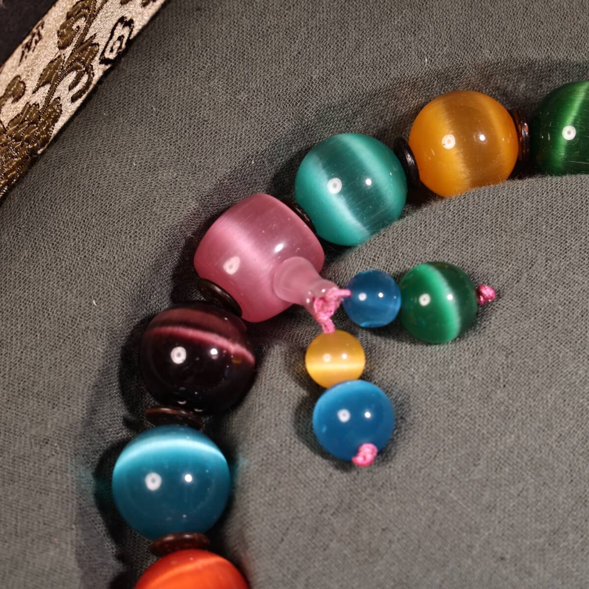 清時代 宮廷御供 古猫目石彫 多宝 七彩 猫目石 十八子手持 手球 把件 箱付 古擺件 時代物 古董品 骨董 收集 旧蔵出 唐物 中国古玩 古美術品