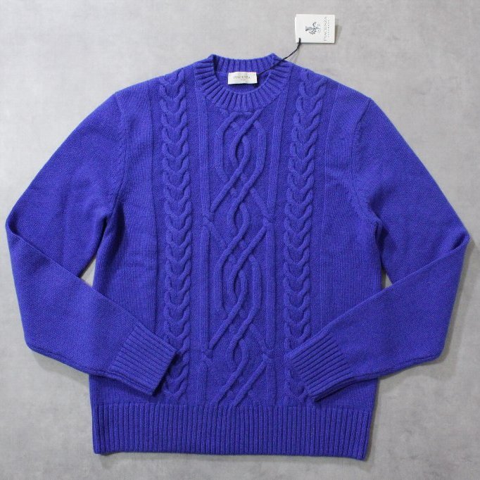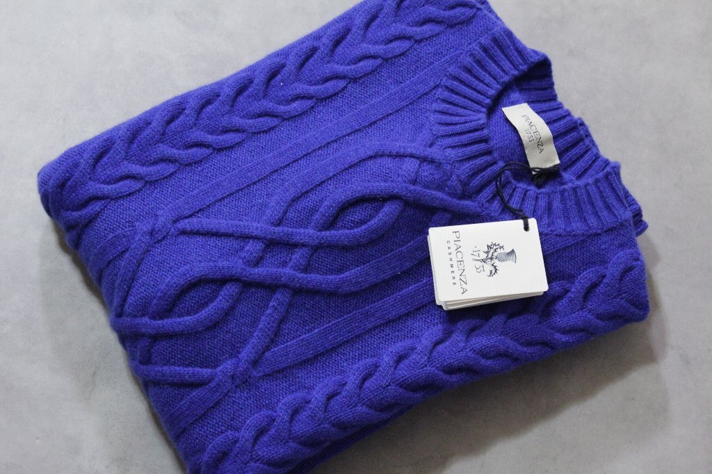 PIACENZA★新品15万円程度 ピアチェンツァ カシミアの名門によるケーブル編みカシミア100%丸首ニット 50 ブルー