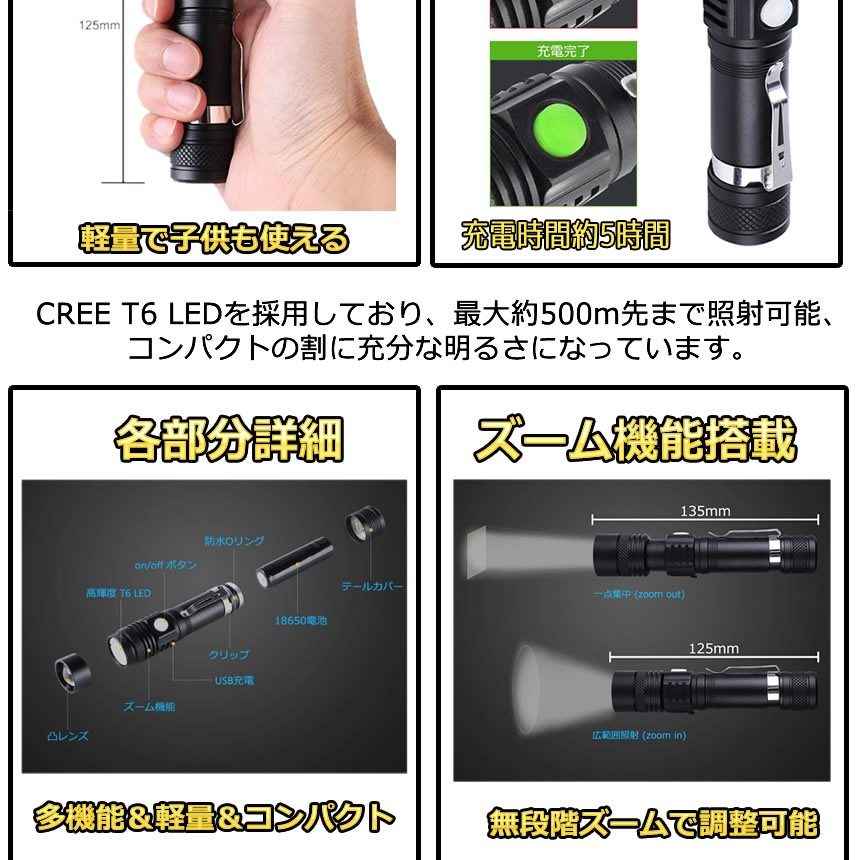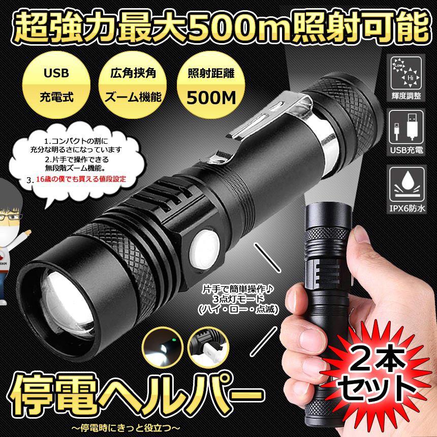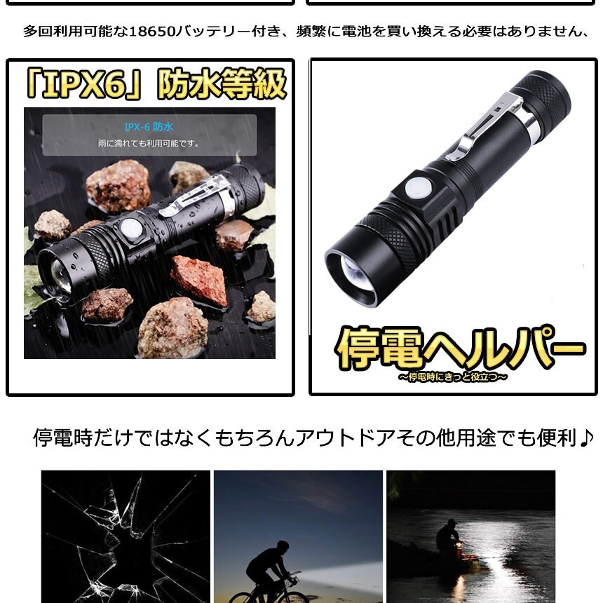 | 送料無料!!! 送料及び下記のご案内をご確認の上、ご入札お願い致します。 離島地域を除く九州、四国、本州まで送料無料。 ※北海道は+1000円、離島地域及び沖縄県は+3000円にて承ります。(発送前に加算) ※画像内にカラー及びサイズ等の選択が可能と記載がある場合がございますが、 お届けする物はタイトルまたは商品説明文に記載の物です。 ★※注文後のカラー変更や異なるカラー・サイズ指定等は一切承っておりません。 ※★※仕様(ロゴデザイン/ロゴ有無等も含む)は予告なく変更する場合があります。 ※多少の汚れや小傷がある場合がございますがご了承ください。 梱包は簡易包装ですので、箱の角落ち等はご了承願います。 【商品説明】 ※こちらの商品はお得な2セット商品です※ 災害時に便利なライトです! CREE T6 LEDを採用しており、 最大約500m先まで照射可能、 コンパクトの割に充分な明るさの持ち運び便利なハンディライトです 多回利用可能な18650バッテリー付き、 頻繁に電池を買い換える必要はありません、 経済的かつ環境にも優しい。 USB充電式で、電池を取り出さないでも スマホのように直接USBケーブルを接続して充電できるので便利です。 懐中電灯の人気機能も備えます。 3点灯モード(ハイ・ロー・点滅)、 片手で操作できる無段階ズーム機能。 耐久性のあるアルミ合金素材を採用して、 優れた耐衝撃性を持ち、 「IPX6」防水等級も取得、アウトドアにも最適! ====================== 【商品仕様】 サイズ(約):130mm×30mm 重量(約):115g 機能:照射(強),照射(弱),高速パッシング,長押しで点滅 ズームMIN:〇型 ズームMAX:□型 ====================== 【付属品】 商品本体、充電コード ※説明書は付属しておりません ====================== ![]() ![]() ![]() ![]() ![]() ![]() |