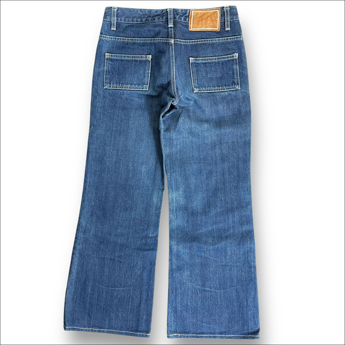⇒ウェスト37センチ、わたり幅27.5センチ、股上22センチ、股下69.5センチ、裾幅25センチ。