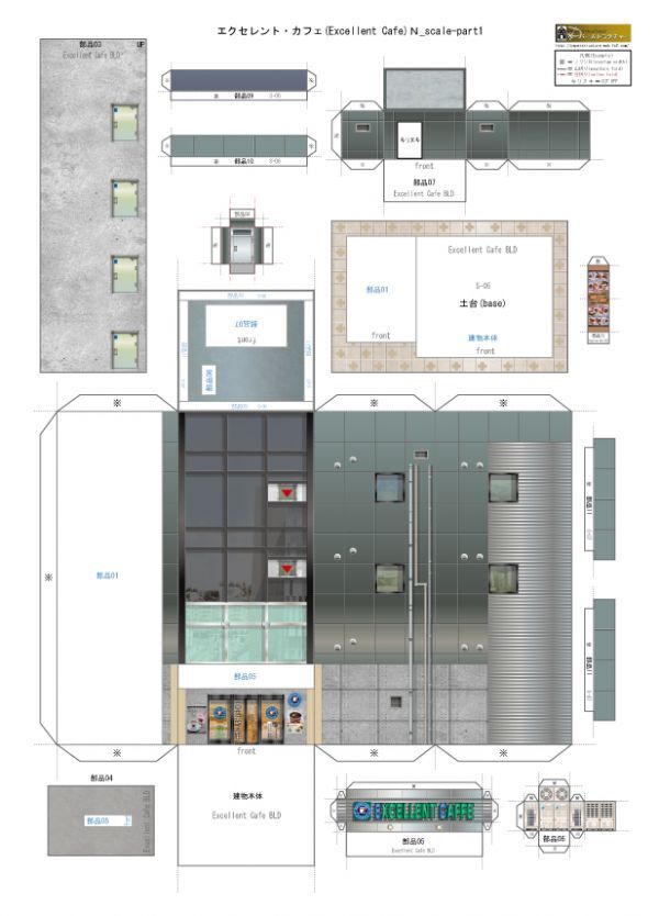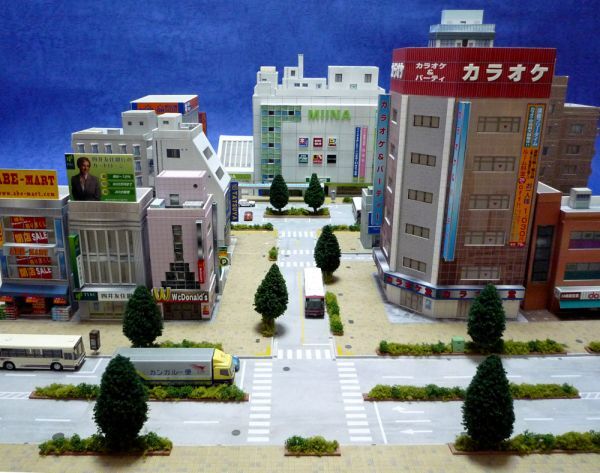 「ゲームセンター」「本屋」「古本屋」「ゲームショップ」「家電量販店」「ドラッグストア」「ファストフード店」「スーパーマーケット」「ビジネスホテル」「カフェ」「不動産ビル」「小さな飲食店」「カラオケ店」「駅直結・大型ホテル」「高層マンション」「マンション」「ディスカウントショップ」「幼稚園」「銀行」「紳士服店」「コンテナC10・C20・C21・C36・UF15A、オリジナルコンテナ」「缶ジュース販売機」「自動改札機」「シネコン付・駅ビル」「警視庁」「お手軽ビル01~04」「色違いver.お手軽ビル01~04」  「テレビ塔 シルバー&レッド」「秋葉原 アニマーズ・ビル」「秋葉原 ビデオ会館」「商店街アーケード」「道頓堀ビル01~07」「温泉ホテル」「ママゾン物流倉庫」「靴店」「バス営業所 通常版&延長版」「戸建て集合住宅」「レンタルビデオ店」「コンビニビル」「エクセレント・カフェ」「牛丼店」「スピードキッチン」「病院ビル01」「調剤薬局」「鉄塔」「たからくじ売り場」「飲み屋」「隙間埋め用小さなビル」「家 01~06」「色違いver.2種類 家 03」「色違いver.2種類 家 04」「色違いver.家 05」「壁 9種類」「看板」  道路データ 1車線道路:18種 2車線道路:21種 4車線道路:15種 バス・ターミナル:3種 駐車場:9種 タバコ自販機:5種 歩道 バス停 配電箱の展開図と制作説明書PDFデータ