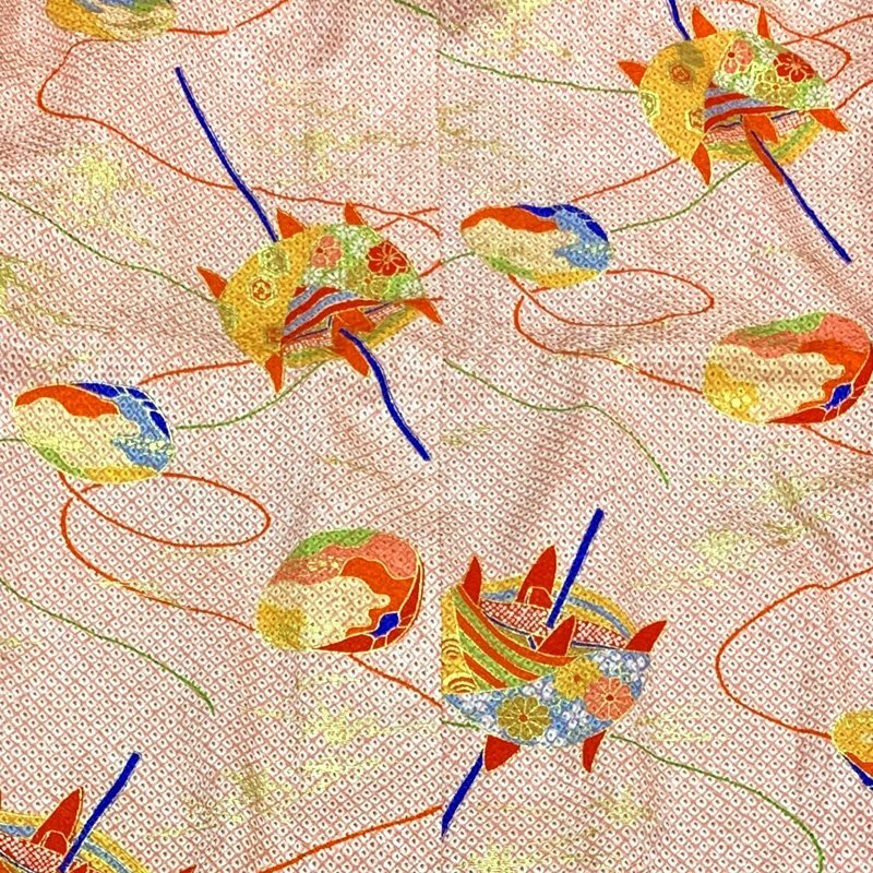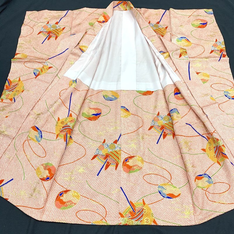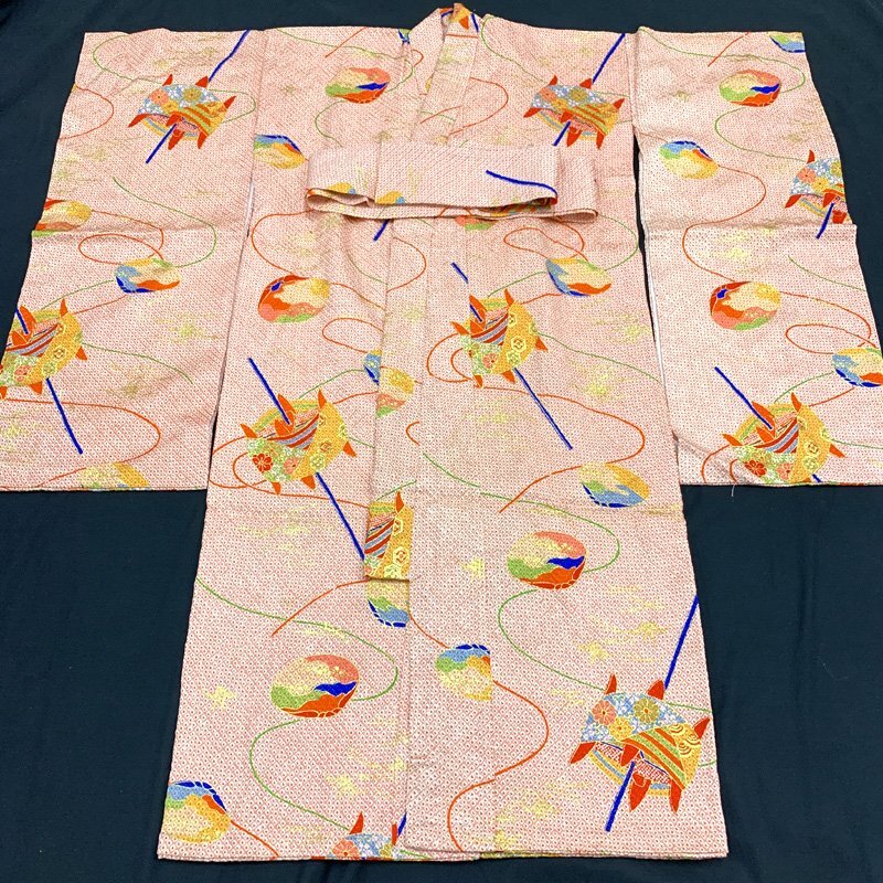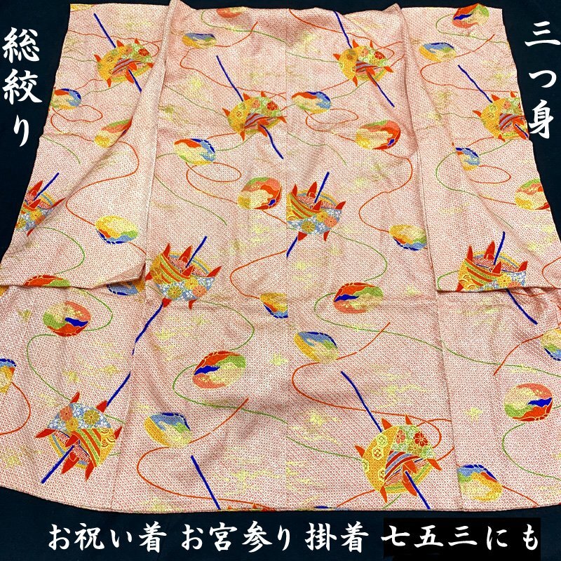 | □お宮参り 女児 祝い着 着物 産着 掛け着 七五三にも 総絞り□状態良好 やや黄味がかったピンク地に、金彩が施された糸巻きや貝合わせ文が可愛らしい総絞りの豪華なお宮参り用の女の子のお祝い着です。三つ身なので、七五三3歳のお着物としてもご着用できます。※前幅22㎝、後幅26㎝なので、身幅が広めのふくよかサイズです。(*8枚目の参考画像で着用している被布は、商品に含まれません。) USED品で、左内袖の袖山にうっすらシミ、右内袖の袂付近にぼんやりシミがございますが近くで見ないと分からない程度です。 【素材】(着物)正絹 【色】やや黄味がかったピンク *モニターによって色味は実際と異なる場合がございます。 【サイズ】(着物) 裄:52cm、袖丈:68cm、身丈(肩から):104cm *素人採寸のため、多少の誤差はご容赦ください。 お宮参りの掛け着としてはもちろん、七五三の3歳のお祝い着としては、お直しや被布と草履などのお小物類をご準備ください(肩上げ、腰上げは手縫いで簡単にできます) 。 | |