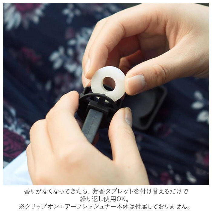 | 注意点 | [香りの持続期間]約30日間 ※香りが薄くなってきたと感じたら、タブレットを取り替えてください。 ※本品は飲食物ではありません。誤飲等にご注意ください。 ※万一飲み込んだ場合はすぐに医師に相談し、指示を仰いだ上で本品を持参し診察を受けてください。 ※本品は香りのオイルを使用しています。直接触れた場合はかぶれる恐れがありますので、石けん等でよく洗い流してください。 ※使用中気分が悪くなった場合は直ちに使用を中止し、気分が回復しない場合は医師の診察を受けてください。 ※エアバッグの作動の妨げにならない位置、また落下した場合でも運転の妨げにならない位置に取り付けてください。 ※オートスイングエアコン車は、スイング止めた状態で使用してください。 ※万一、車内や衣類等に香料が付いてしまった場合、すぐ拭き取る等の処置をしてください。変色・変質する場合があります。 ※お子さまやペットの手の届かないところで使用・保管してください。 ※引火性があり危険ですので火気には近づけないでください。 ※直射日光や高温多湿(60度以上)、凍結する場所を避けて使用・保管してください。 ※用途以外には使用しないでください。 ※カメラやモニターの性質により、画像と実物の色の違いがある場合がございますのでご理解願います。 |