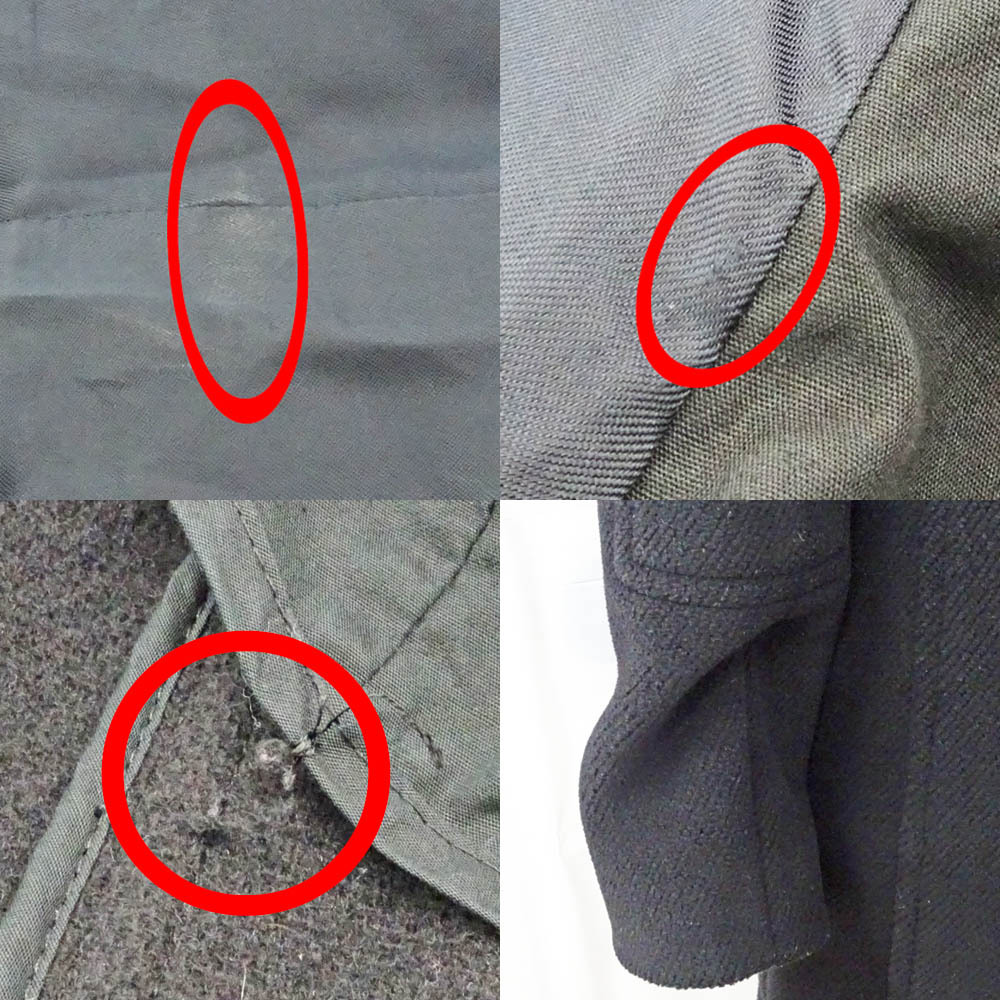また、生地の剥げ、袖裏の薄汚れ、引きつれ、脇の裏地の糸のちぎれ、左袖のくせ、トグルボタンを留めるレザー部分の剥げ、ひび割れ、糸の緩み、金具部分の擦れや小傷がございます。