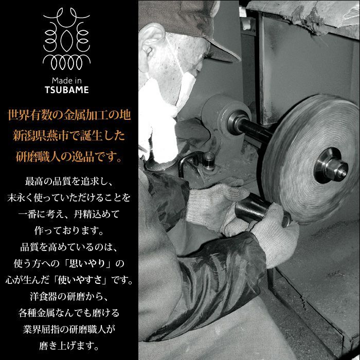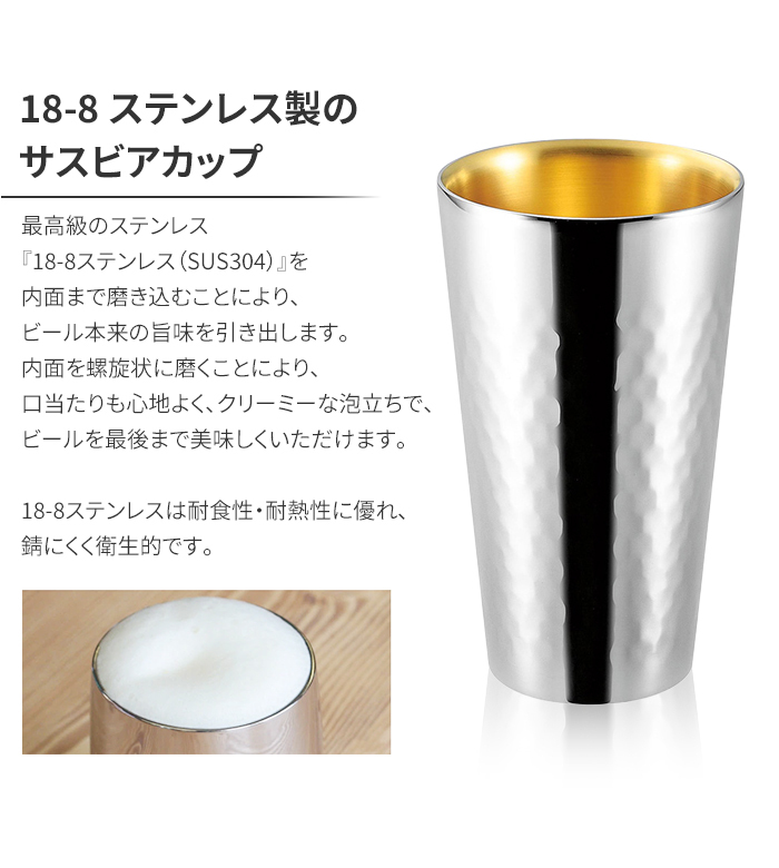 | 『18-8ステンレス』製の外面には鎚目(ツチメ)模様が入り、内面に金メッキした高級感あるデザインのカップです。 『18-8ステンレス』は、耐食性・耐熱性に優れており錆びにくく衛生的な材質です。 温かさ・冷たさが長持ちし、飲み頃を保つ2重構造製です。 新潟県燕市は、古くから金属加工の街として栄えた職人の街です。 燕の職人がカップを徹底的に磨きこみ、細部にまでこだわって作り上げました。 最高級のステンレス「18-8ステンレス(SUS304)」を内面まで磨きこむことにより、ビール本来の旨みを引き出します。 内面を螺旋状に磨くことにより、口当たりも心地よく、クリーミーな泡立ちで、ビールを最後まで美味しくいただけます。 |