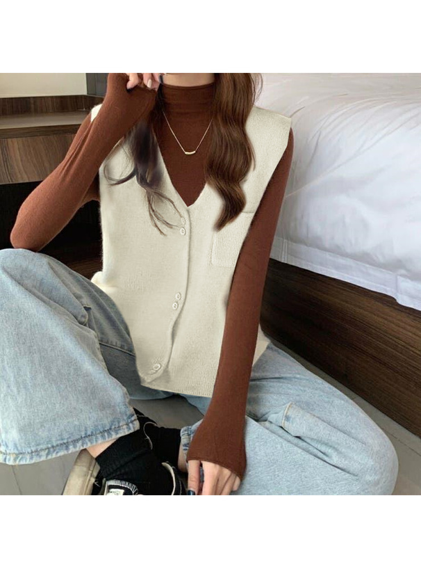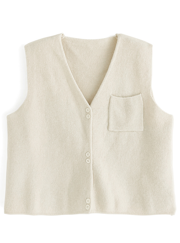いつものコーデにプラスするだけでマニッシュな雰囲気が漂うニットベスト。胸ポケットがカジュアルなワンポイントに。