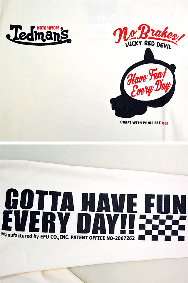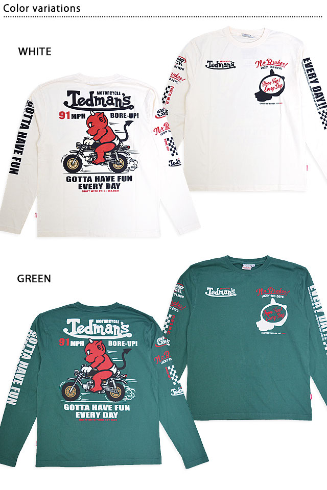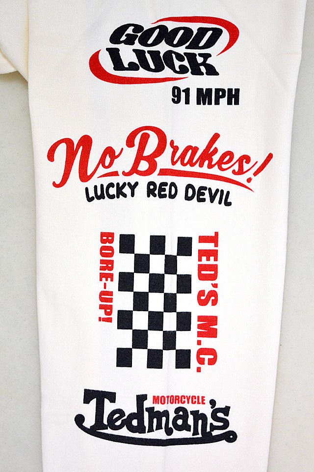 テッドマンから「TED'S MOTORCYCLEロングTシャツ(TDLS-365)」のご紹介です! 愛車に跨り、疾走するテッドマンの姿を背中にダイナミックに落とし込みました。 テッドマンとミニバイクとのサイズ感が絶妙なデザインです。 左袖には「GOTTA HAVE FUN EVERY DAY!!」というレタードと、チェッカーフラッグをプリント。 右袖には様々なテッドマンのロゴを肩から袖に向かって並べました。 生地には、テッドマンお馴染のよれにくくタフなボディーを採用しています。 | |||||||||||||||||||||||||