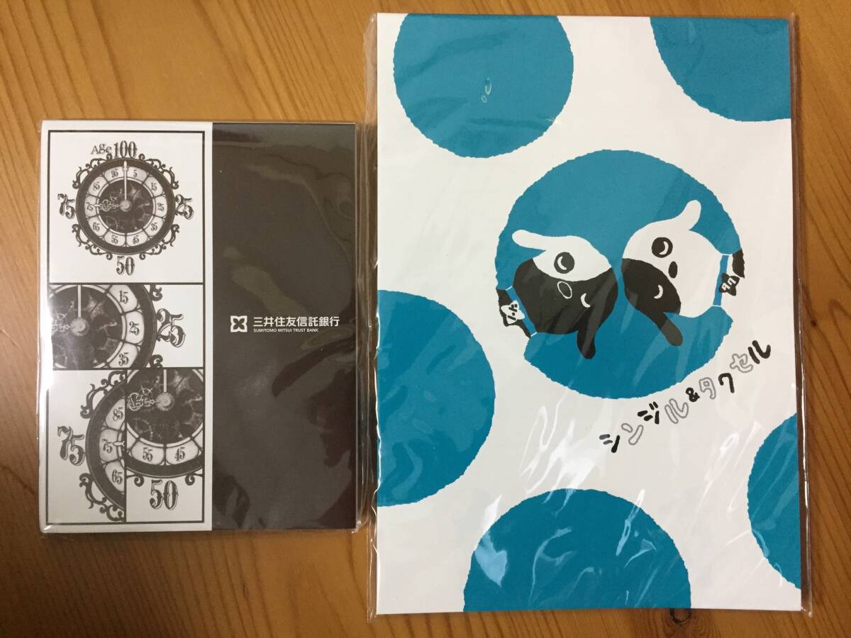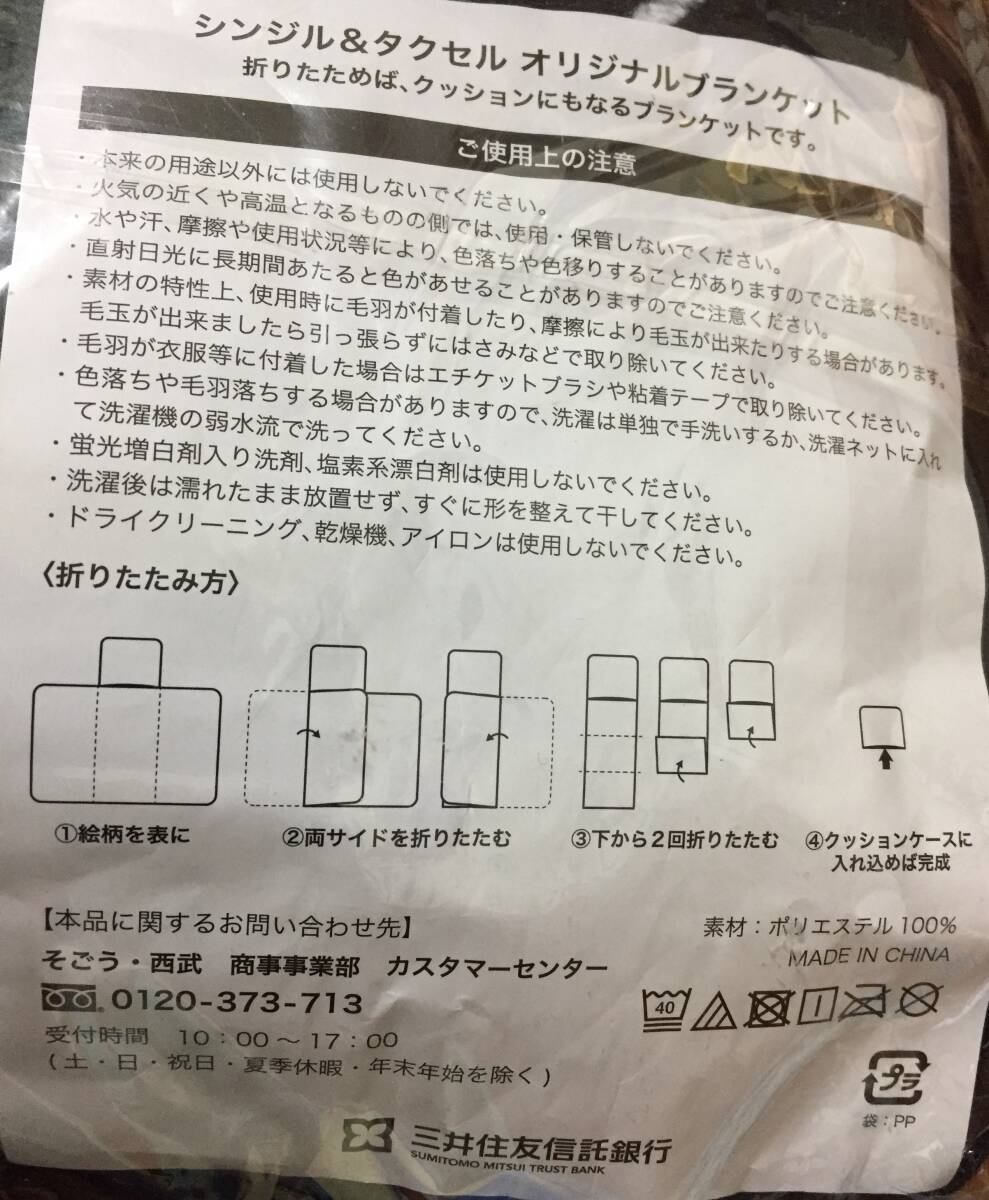 新品★非売品★未開封 三井住友信託銀行 シンジル&タクセル オリジナルブランケット&メモ帳 全て新品です。 ■折りたためばクッションにもなるブランケット 2個 材質 : ポリエステル100% サイズ : ブランケットで使用する時 約58×86㎝ クッションで使用する時 約33×23㎝ ■メモ帳 2個 | |