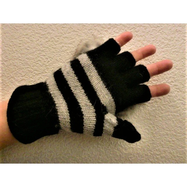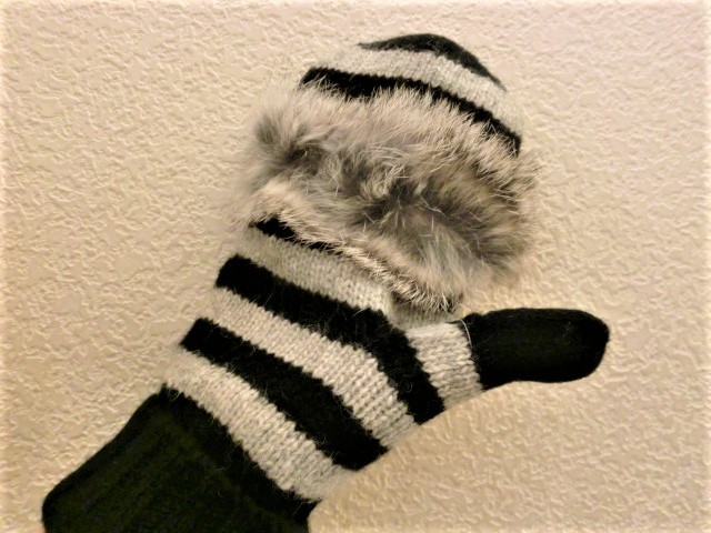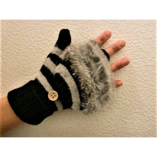 レディースファッション 手袋 天然ラビットファー付き(2WAY)可愛いボーダー柄ニット 指先無し手袋 サービス品 ブラック