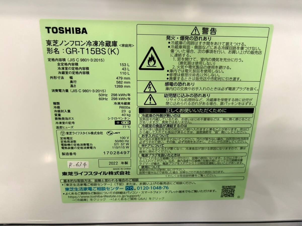 大阪送料無料★3か月保障付き★冷蔵庫★2022年★東芝★2ドア★GR-T15BS(K)★R-634