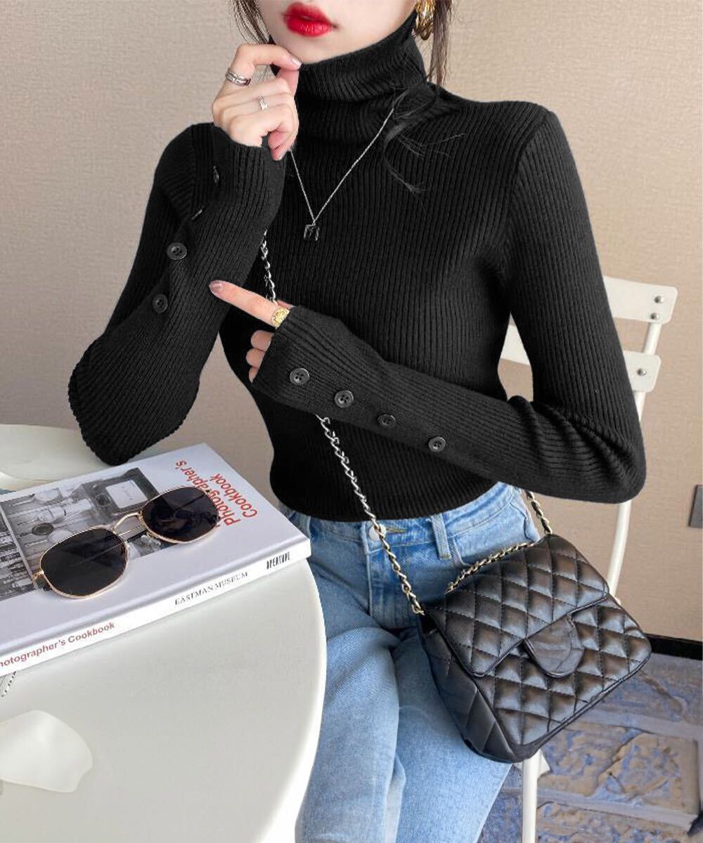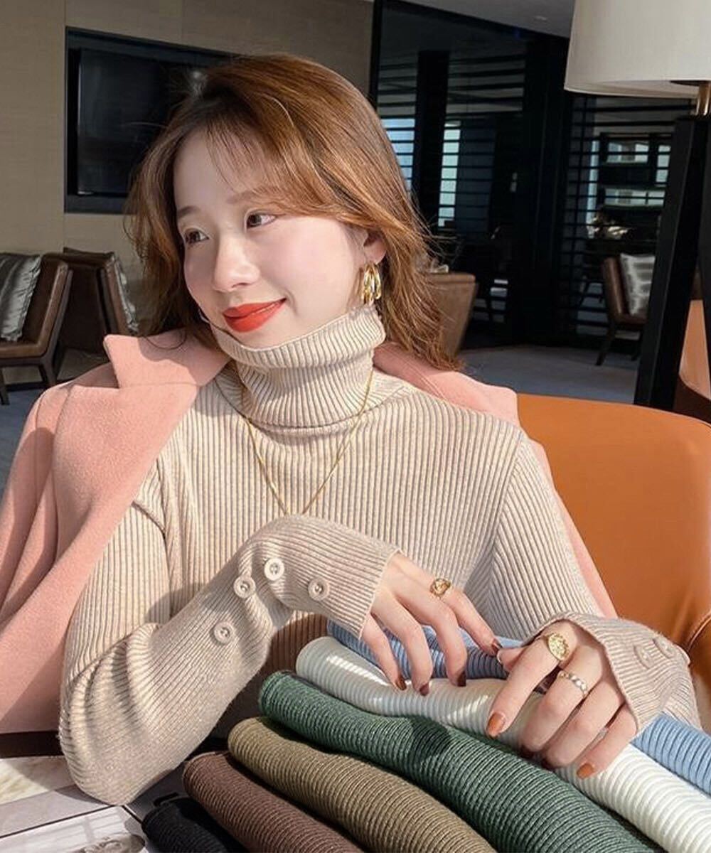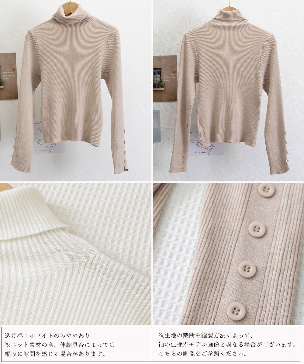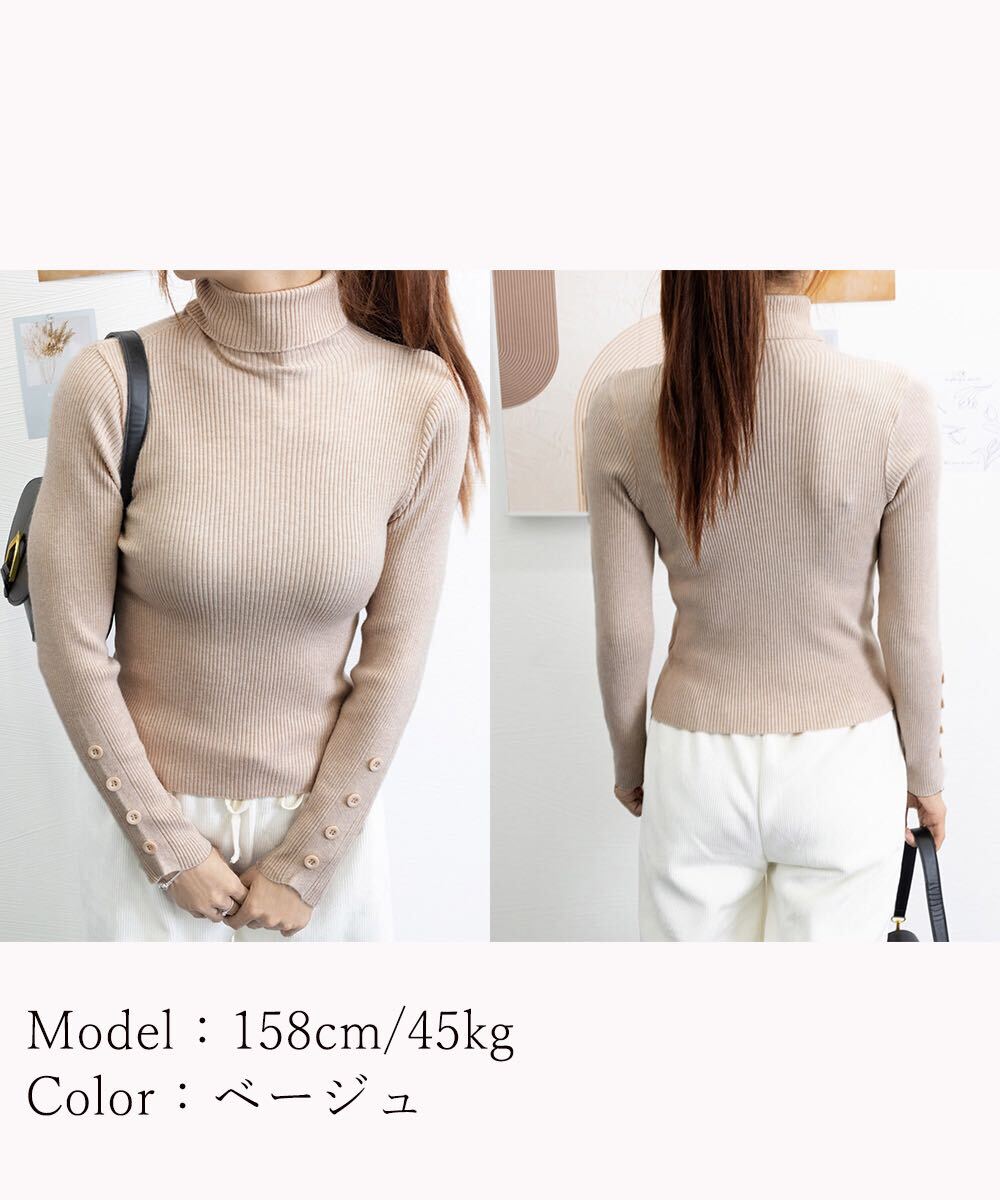 袖ボタンがカワイイ、ハイネックリブニットトップスです