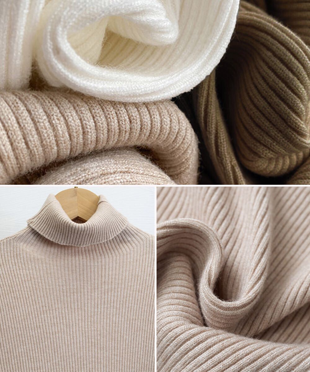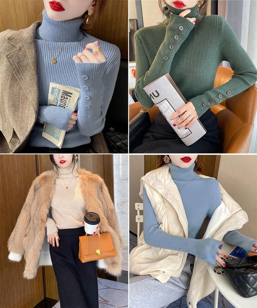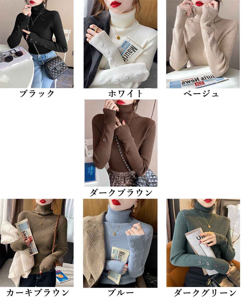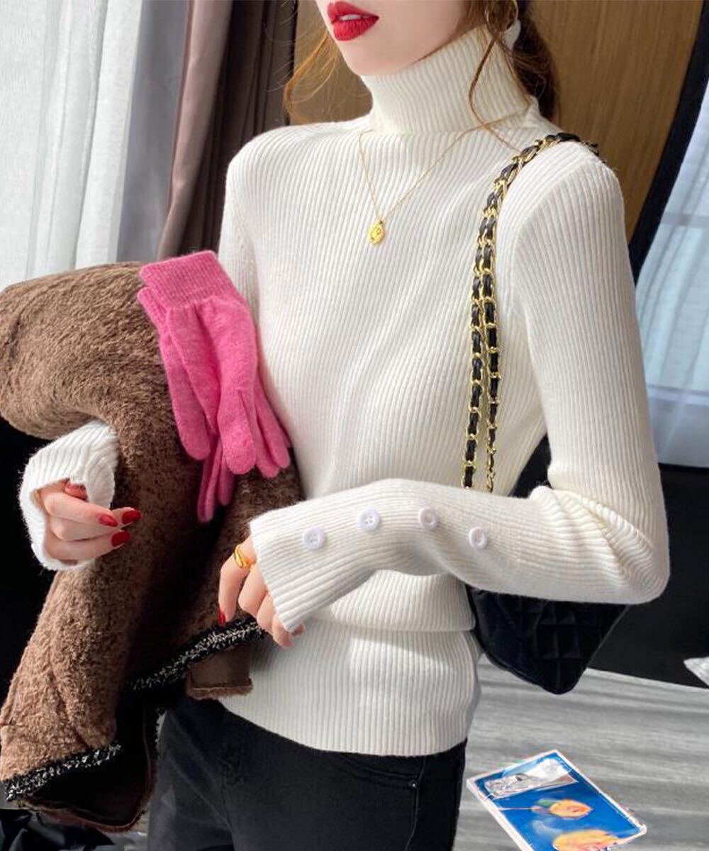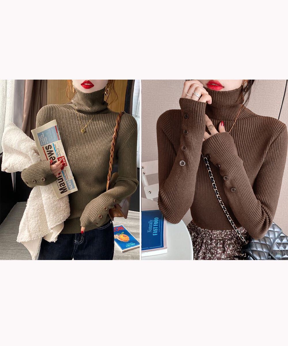 袖ボタンがカワイイ、ハイネックリブニットトップスです