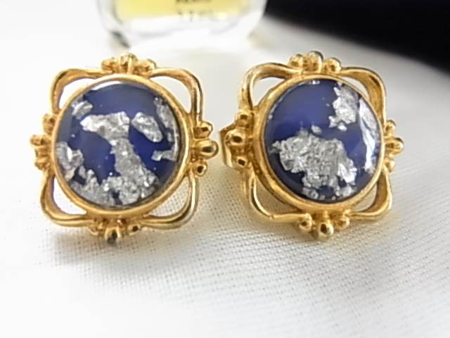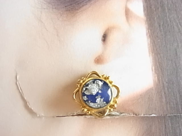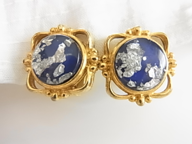 ビンテージ/ヴィンテージ 和モダンテイスト 着物にも素敵 瑠璃紺色 るりいろトーンに銀トーンの装飾柄 金色も綺麗イヤリング◆
