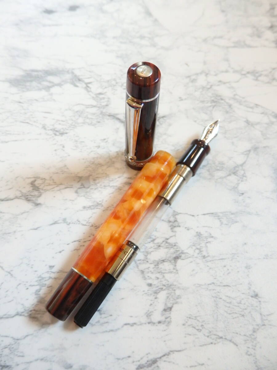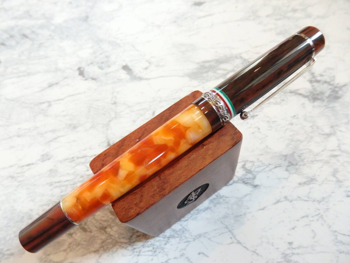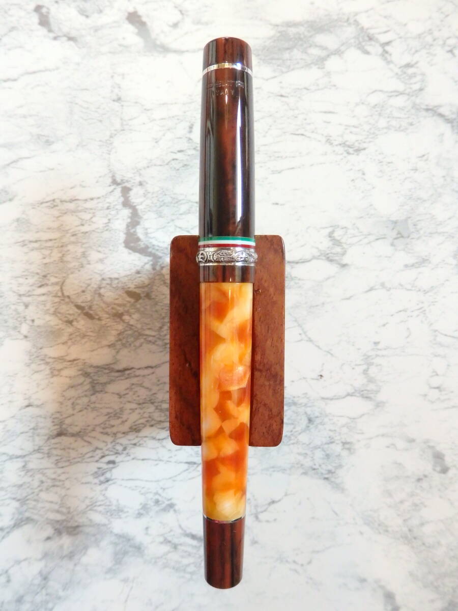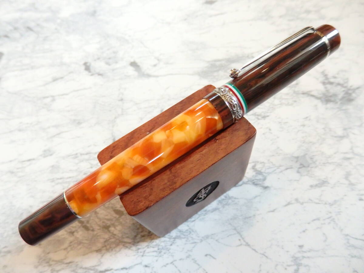 天冠とキャップ、尻軸にはエボナイトを彷彿とさせるような美しいブラウンの樹脂が奢られています