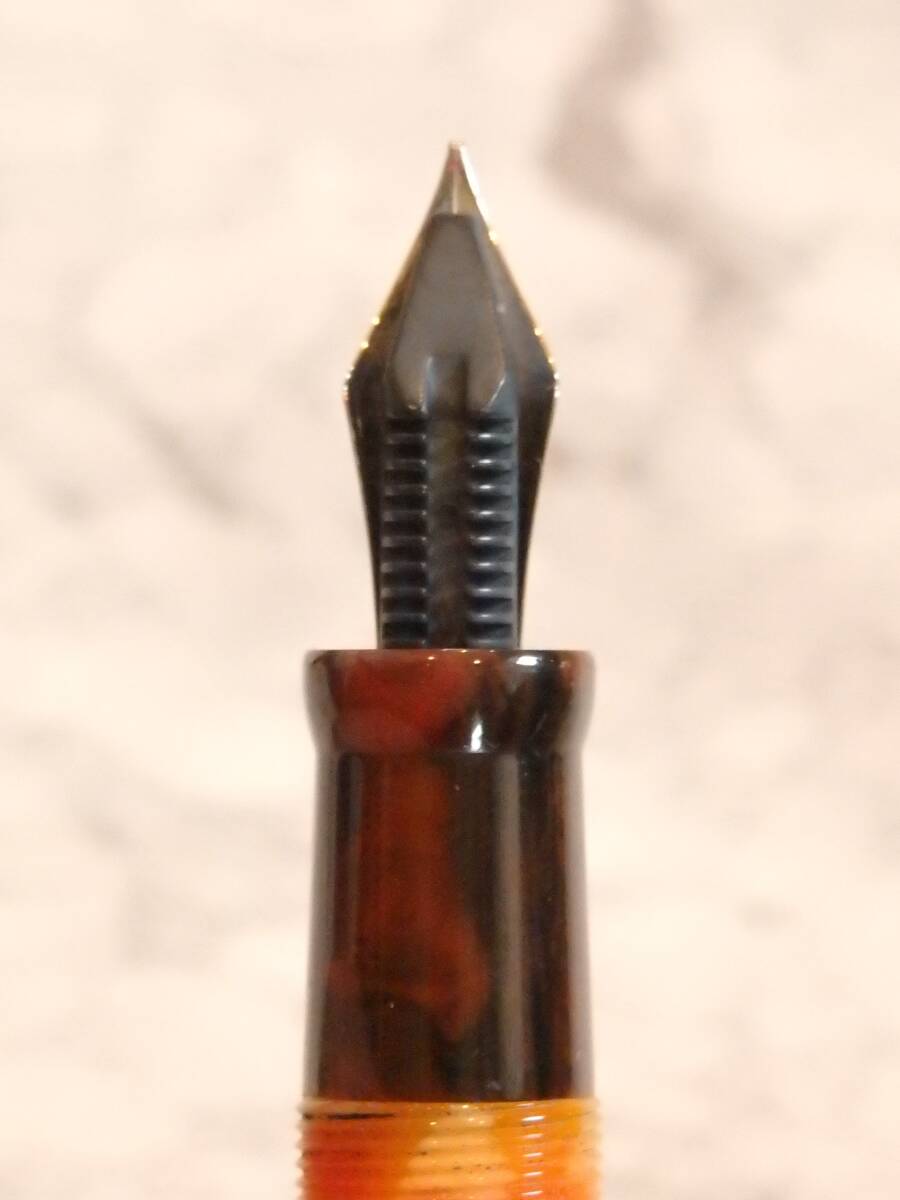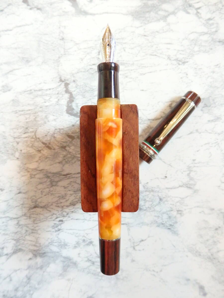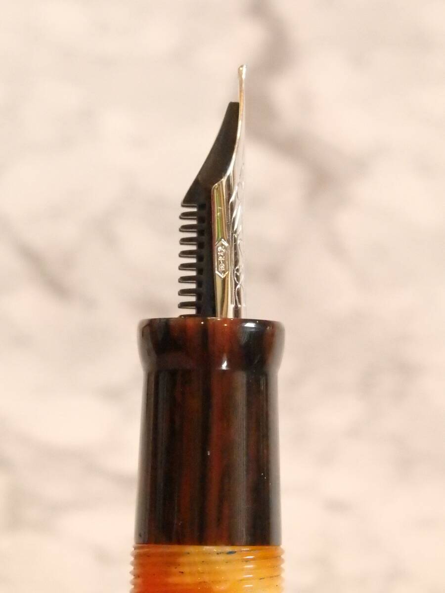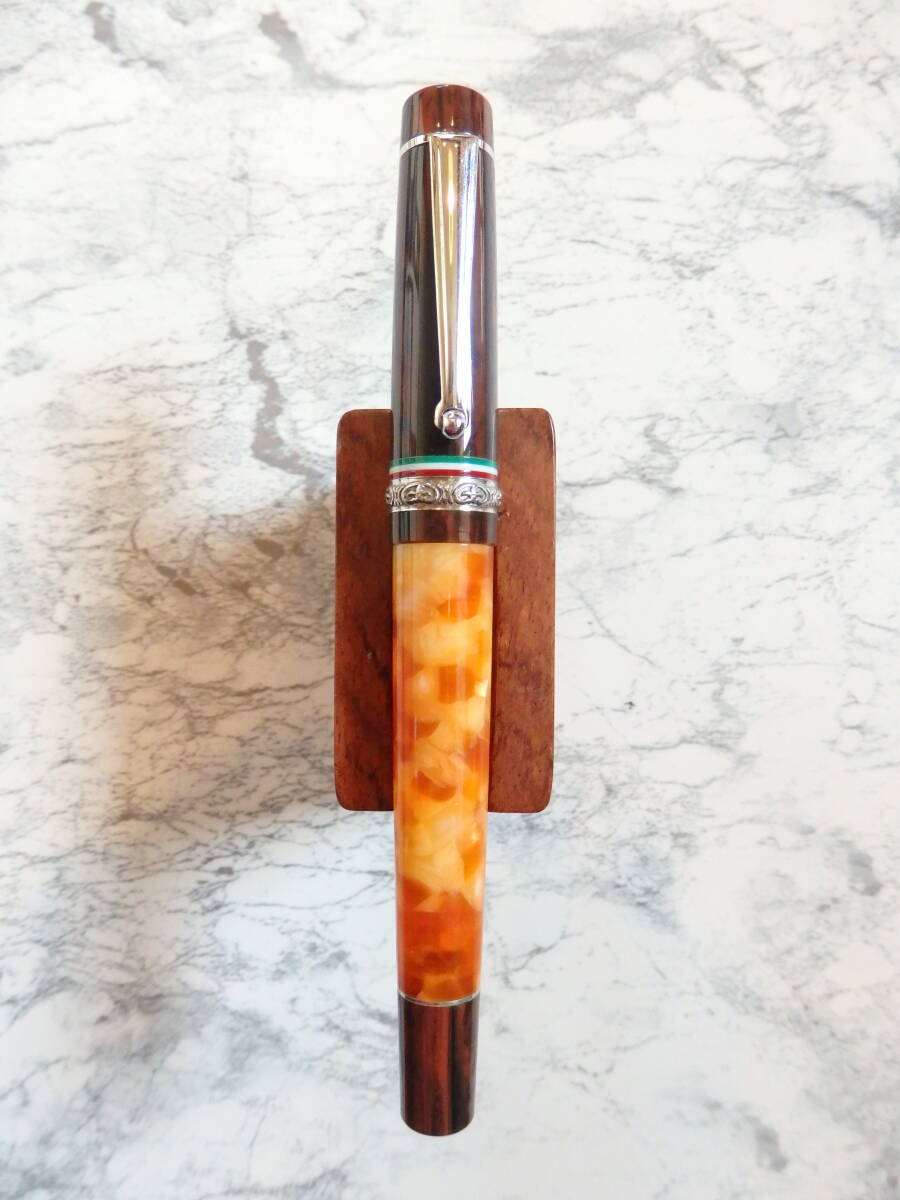 天冠とキャップ、尻軸にはエボナイトを彷彿とさせるような美しいブラウンの樹脂が奢られています