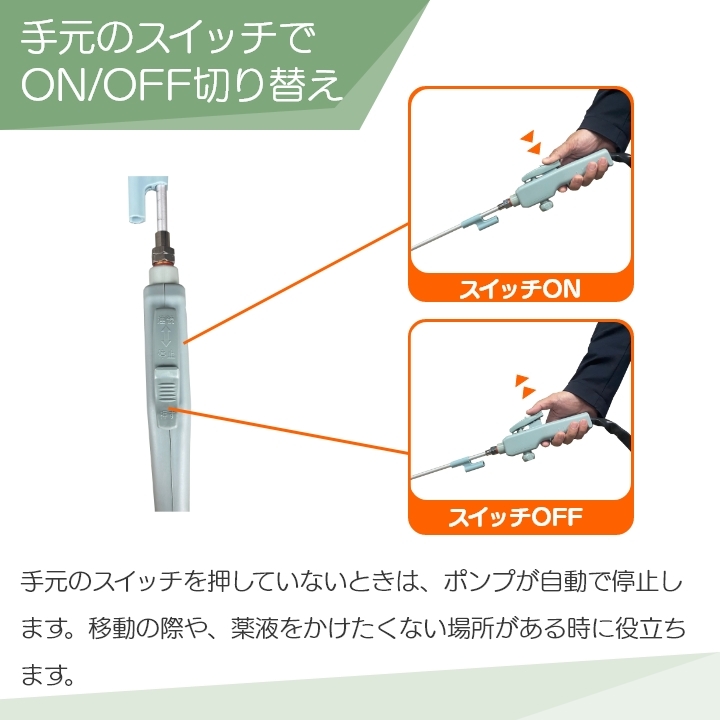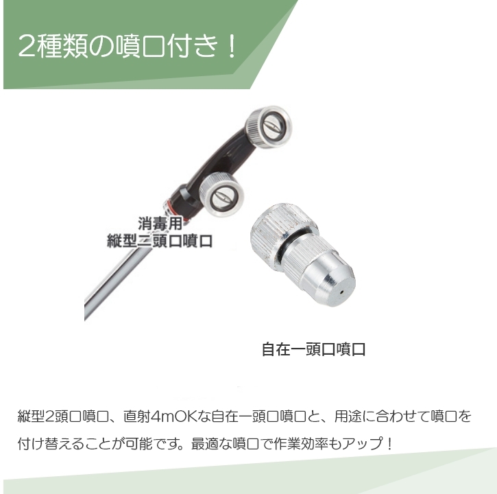 噴霧目安:縦型二頭口:幅1m、直射散布:(斜め45度)約4m