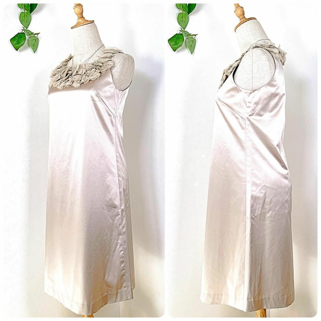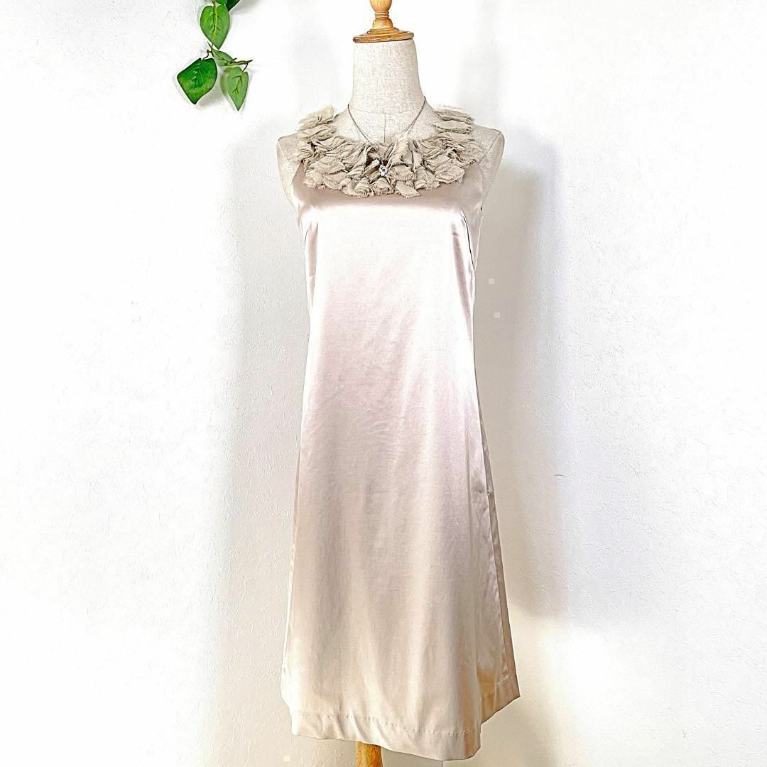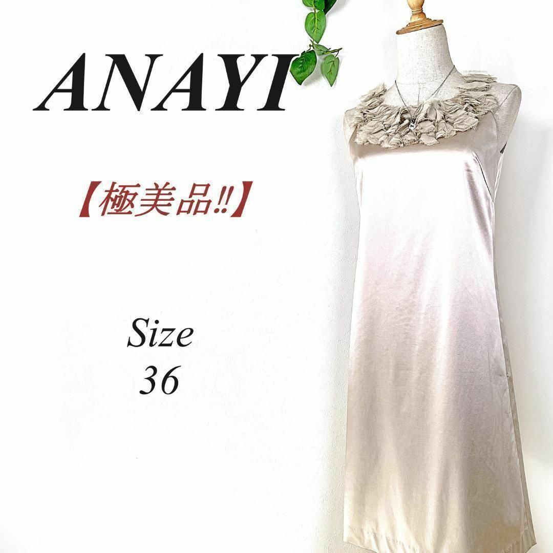 【極美品】 ANAYI フロントシフォン ノースリーブワンピース パーティードレス サテン 光沢感 36 アナイ ライトベージュ ひざ丈ワンピース