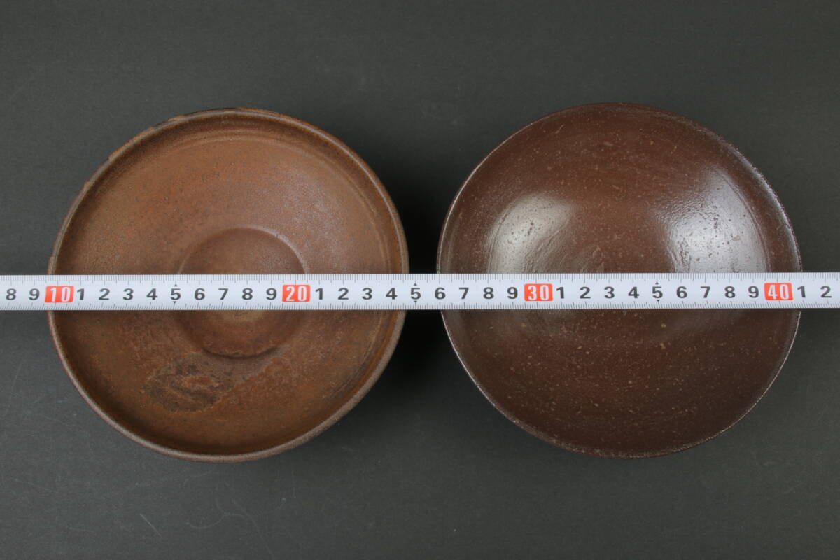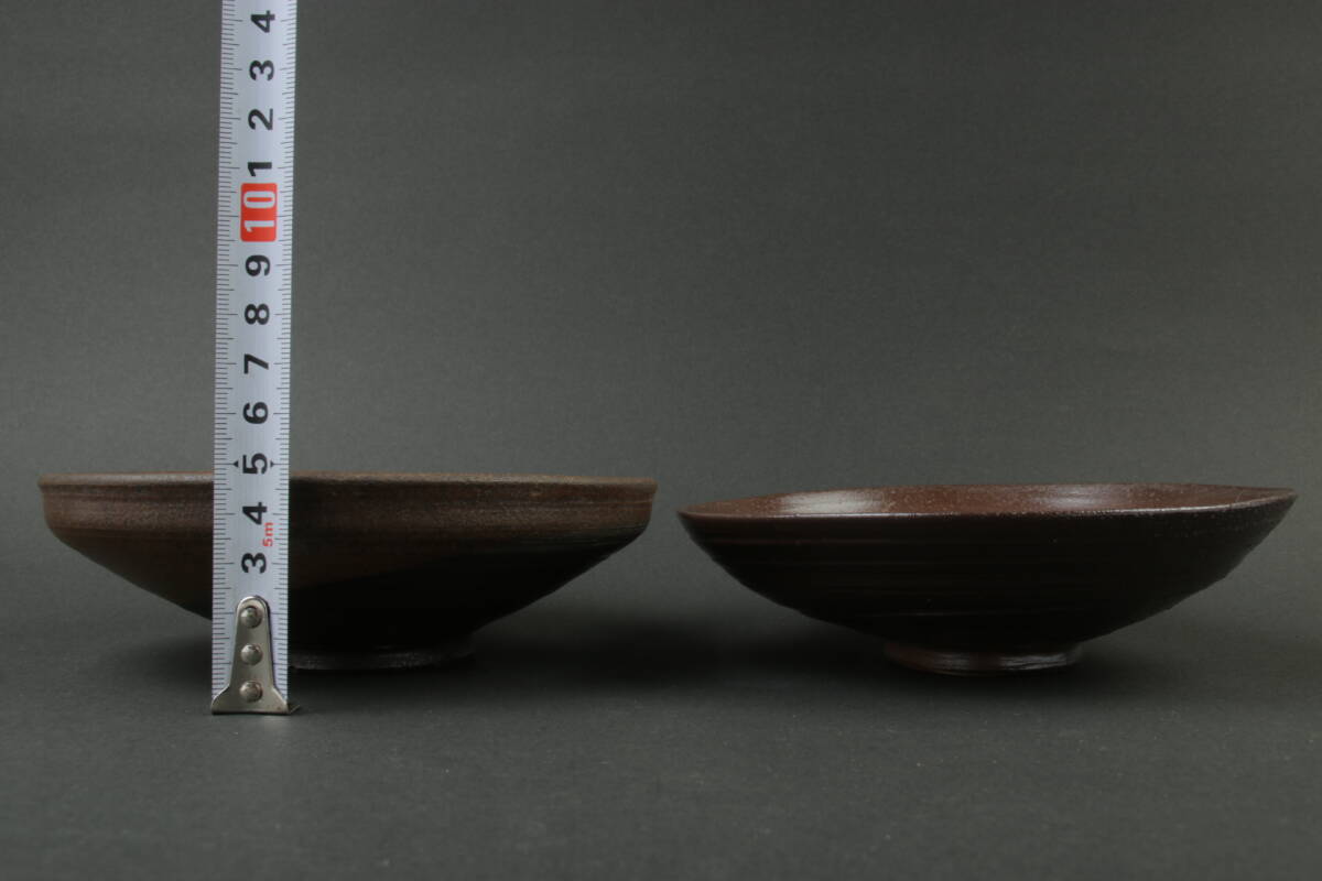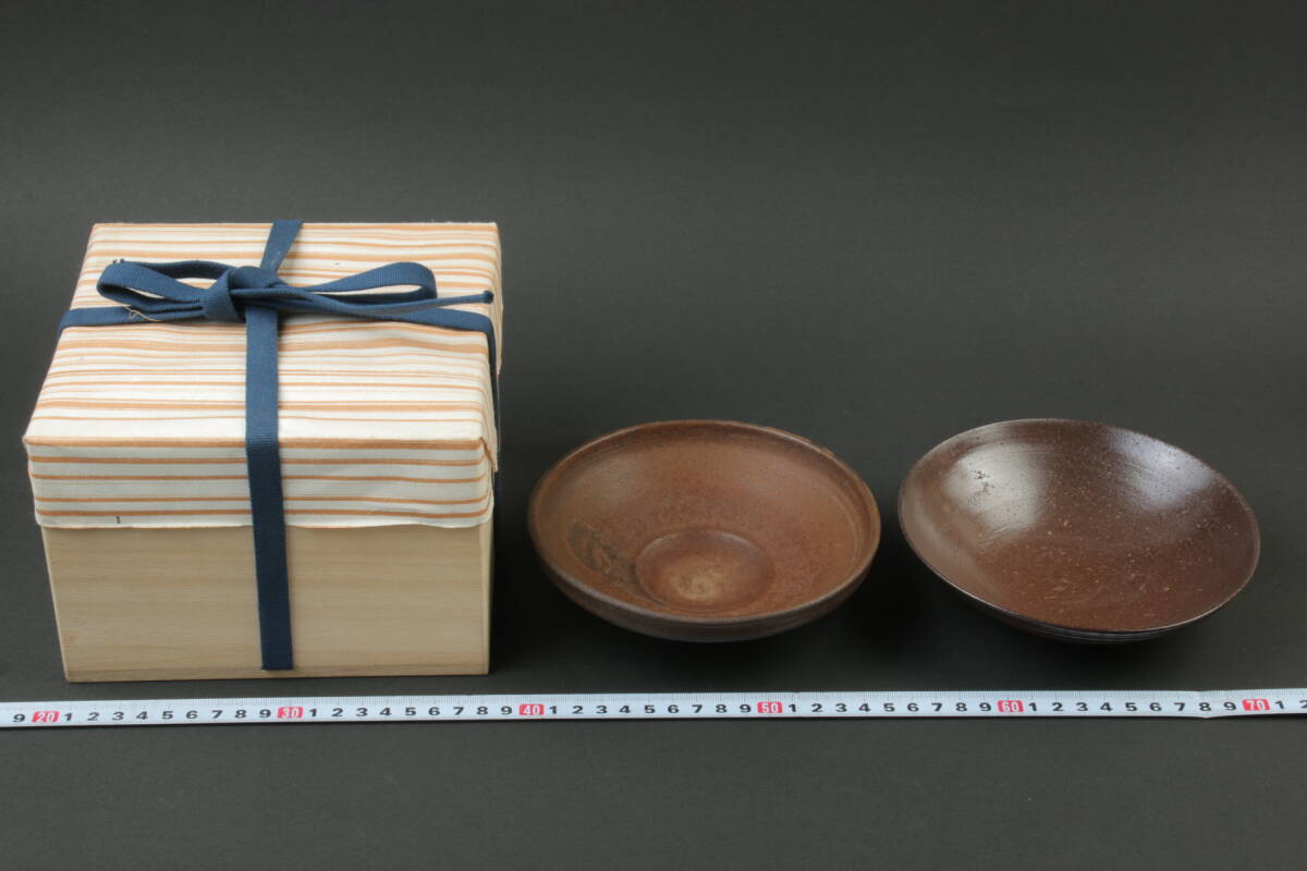 6802 常滑焼 名工 滝田椿渓 2個組 朱泥 茶道具 平茶碗 抹茶茶碗 木箱 布