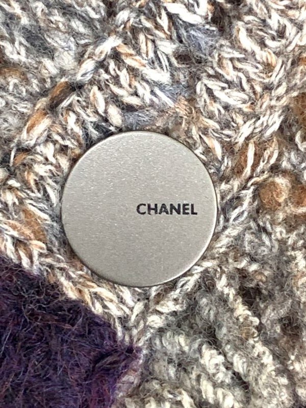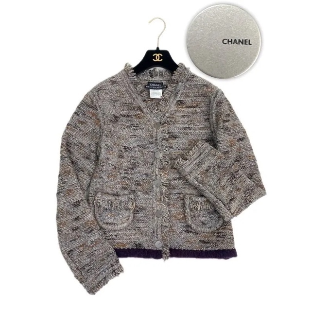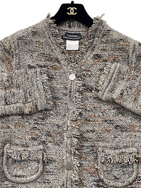 グレー黒ブラウンオフホワイトのニット地で編み込まれたシンプルなカーディガン。