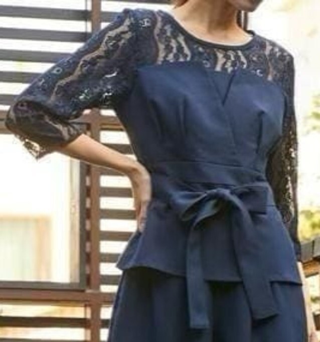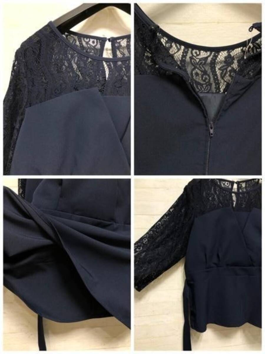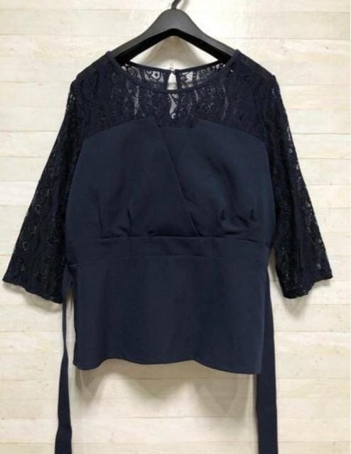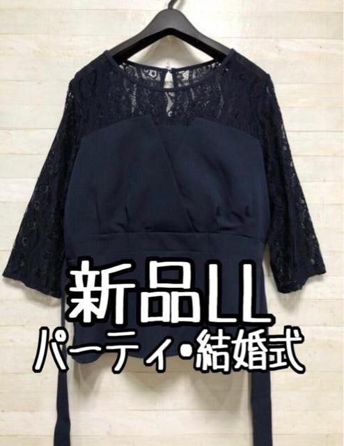 新品☆LL紺系レース切替おしゃれベアトップ風ブラウス〇A914