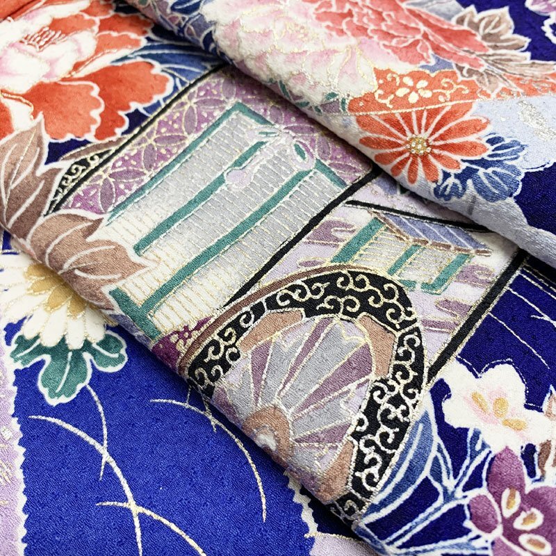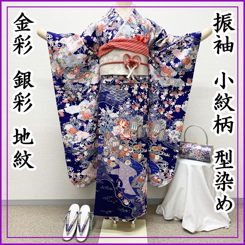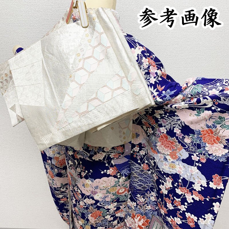| ☆振袖 小紋柄 金彩 銀彩 地紋 型染め 御所車 牡丹 古典柄 濃い青☆美品 成人式 結婚式 (No.ed) 濃い青地に、御所車や牡丹、菊、梅などの古典柄が描かれた振袖です。小紋柄ですが、絵羽の一部分のみ柄が繋がっており、ところどころ金彩や銀彩が施されています。 画像の袋帯404y4、重ね衿、帯締め、帯揚げは参考商品ですが、在庫がある場合に限り+10,000円で振袖とセットでお譲りすること可能です。半衿は私物のためお譲りいたしかねます。草履バッグセット406v52は参考商品です。 画像のように左内袖にシミと、左袖の袂に使用汚れがございますが、遠目にはあまり気になりません。特に目立つようなシミ・ダメージはなく美品です。 【素材】正絹 【色】濃い群青色、青、ピンク *モニターによって色味は実際と異なる場合がございます。 【サイズ】