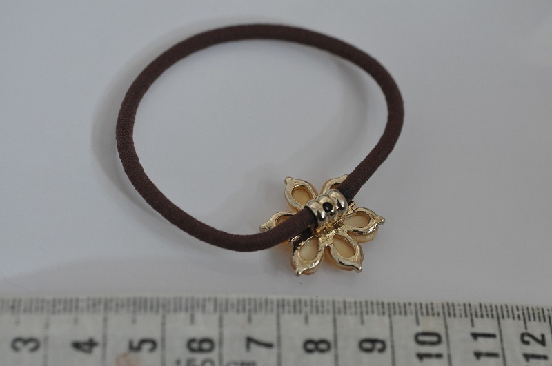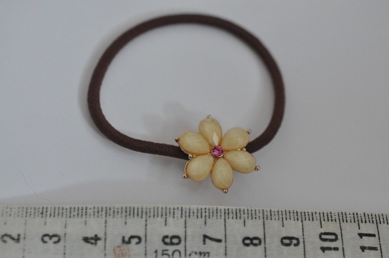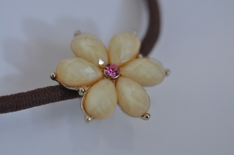 淡いオレンジ系ののビジューのお花のついたヘアゴムです。中央のラインストーンはピンク。