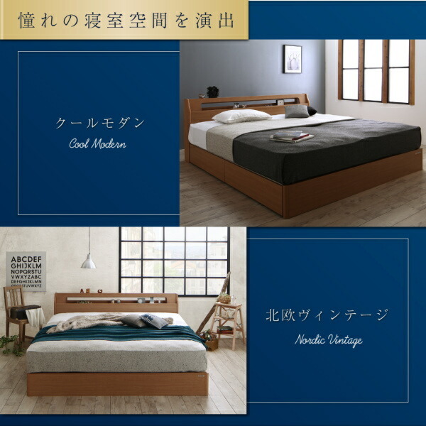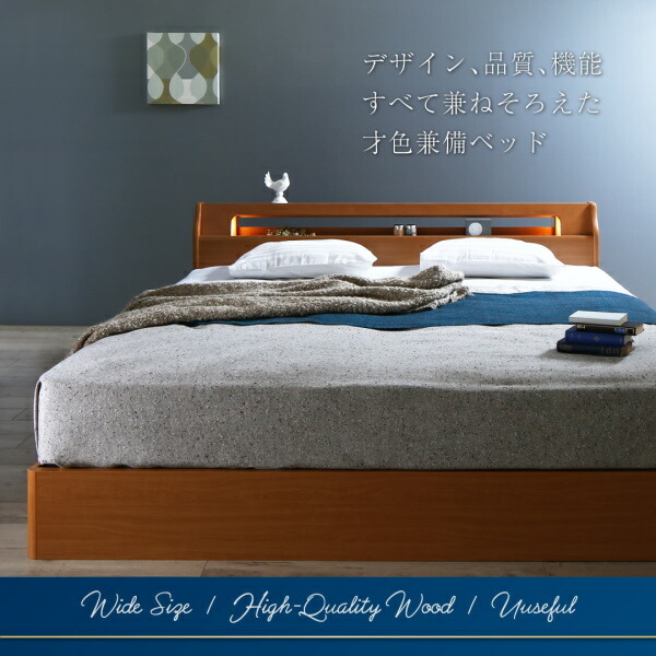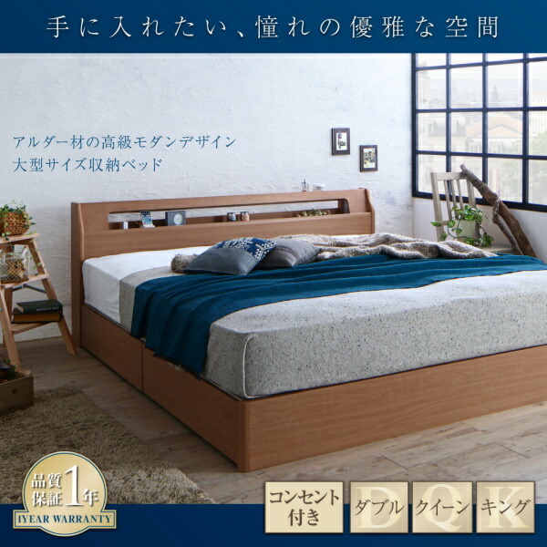 高級アルダー材ワイドサイズデザイン収納ベッド プレミアム国産ハードポケットコイルマットレス付き スリムタイプ ダブル