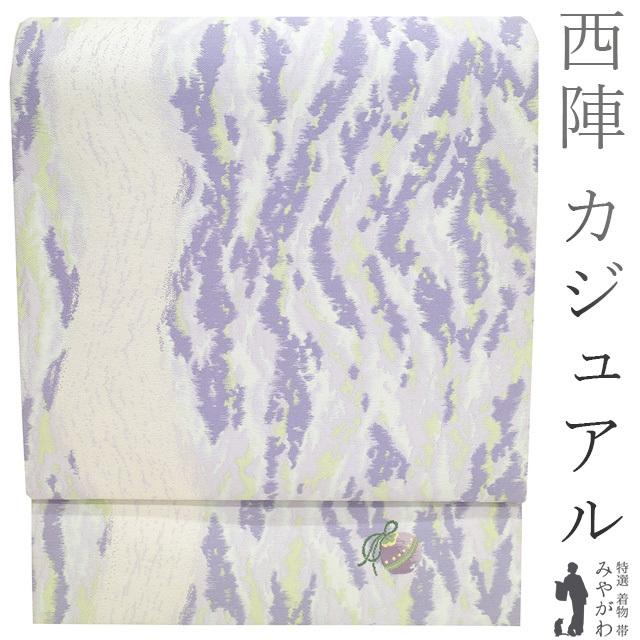 開き 名古屋帯 リサイクル 正絹 京都 西陣 白 紫 黄緑 霞 ワンポイント 鈴 織り柄 カジュアル 中古 仕立て上がり みやがわ sb53299