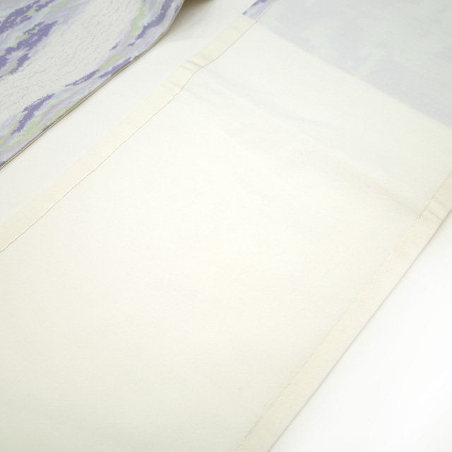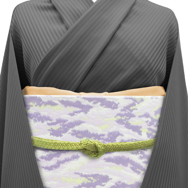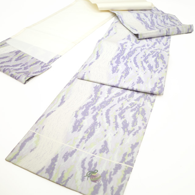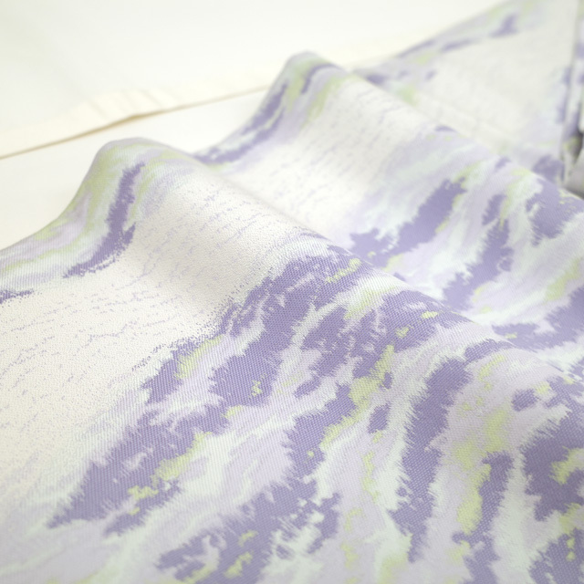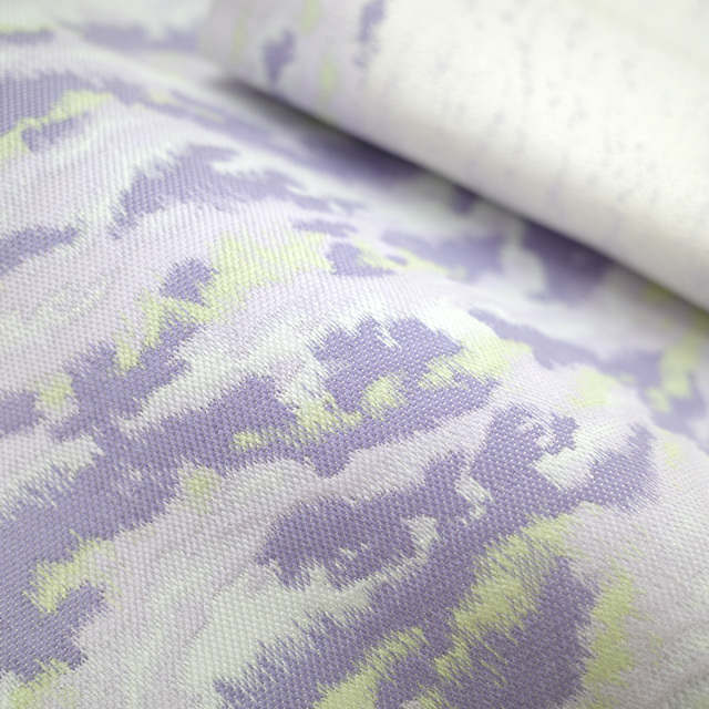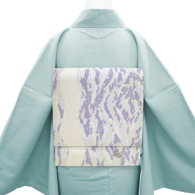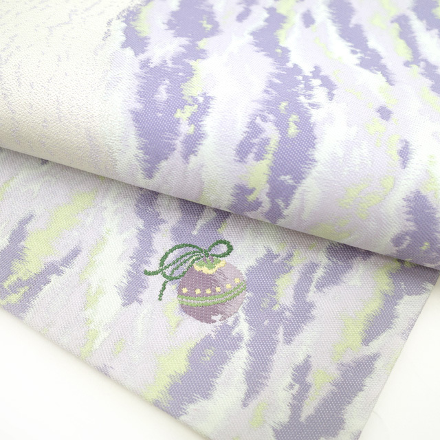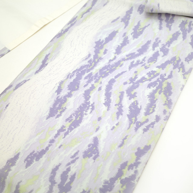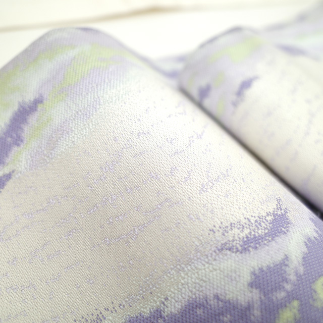 白・紫・黄緑 などで霞が織り出されたこちらのお品。
