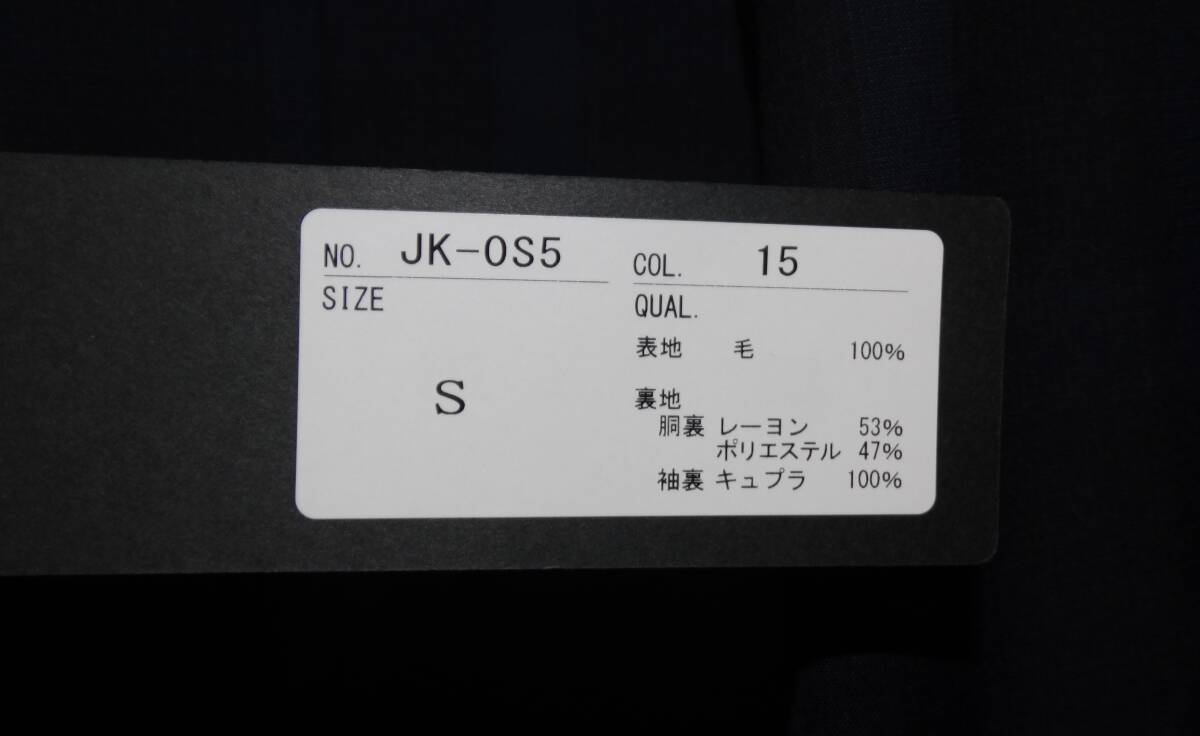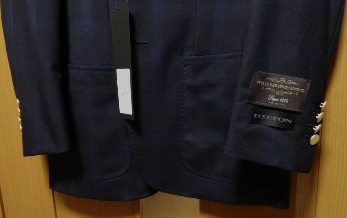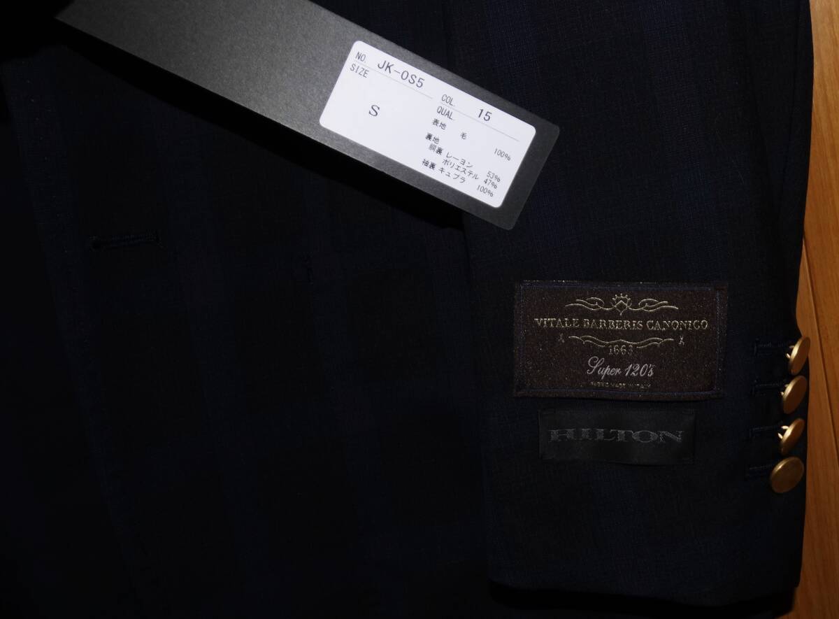 HILTONの紺色系のサイドベンツで、3ッボタンジャケットです。サイズはSサイズで表地は毛100%のスタイリッシュなデザインです。